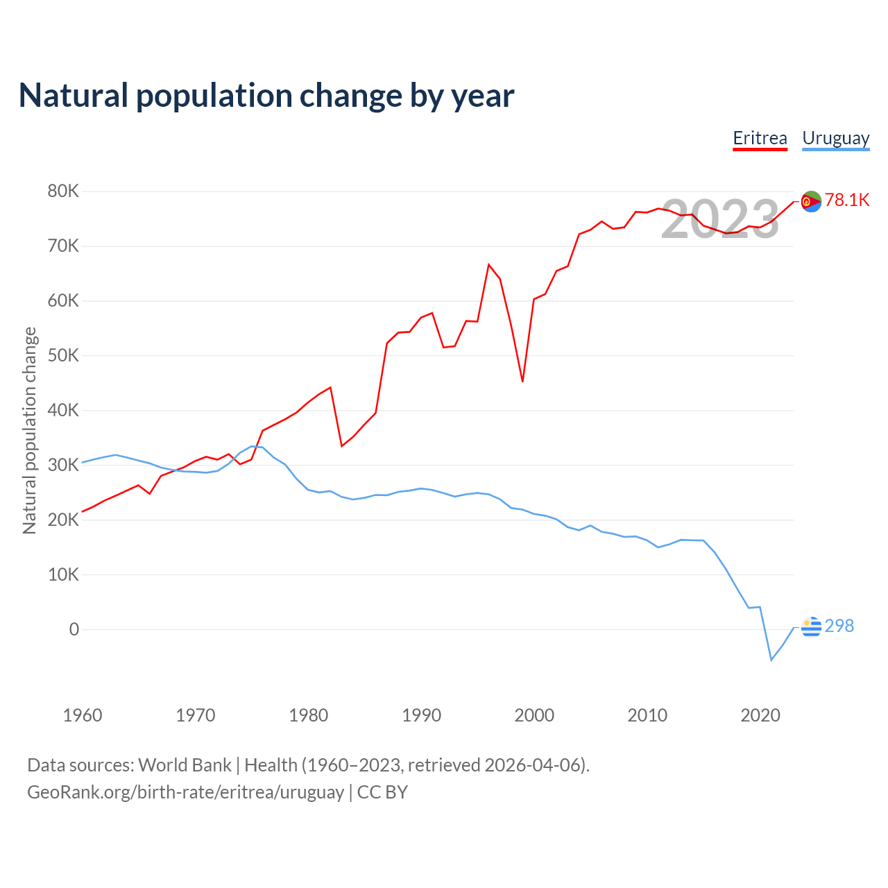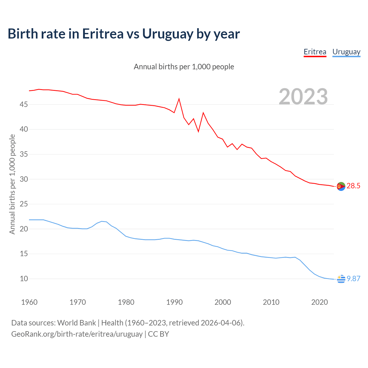 Eritrea has an annual birth rate of 28.5 births per 1,000 people, compared to 9.87 for Uruguay. The average number of children a woman is expected to have during her lifetime — the fertility rate, is 3.71 in Eritrea and 1.41 in Uruguay — 62.1% difference.