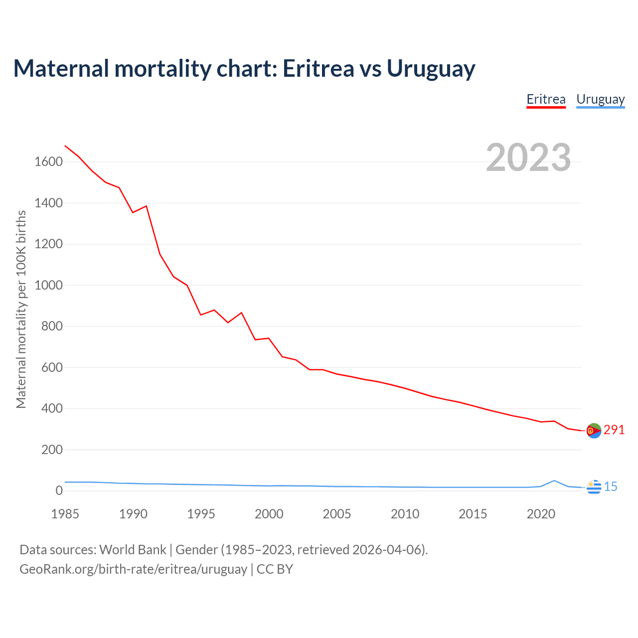 - Annual births per 1,000 women ages 15-19 (adolescent birth rate or teenage mother rate) is 65.2 in Eritrea vs 26.2 in Uruguay.