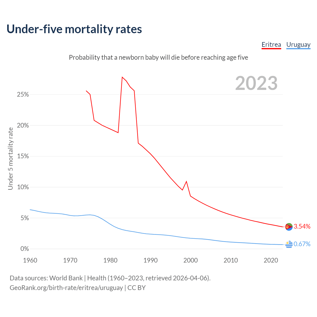 The chance that a newborn baby will die before reaching age five is 3.54% in Eritrea and 0.67% in Uruguay. Above is a chart with historical data on under-five mortality rates.