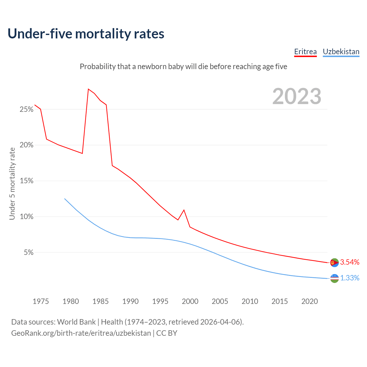 The chance that a newborn baby will die before reaching age five is 3.54% in Eritrea and 1.33% in Uzbekistan. Above is a chart with historical data on under-five mortality rates.