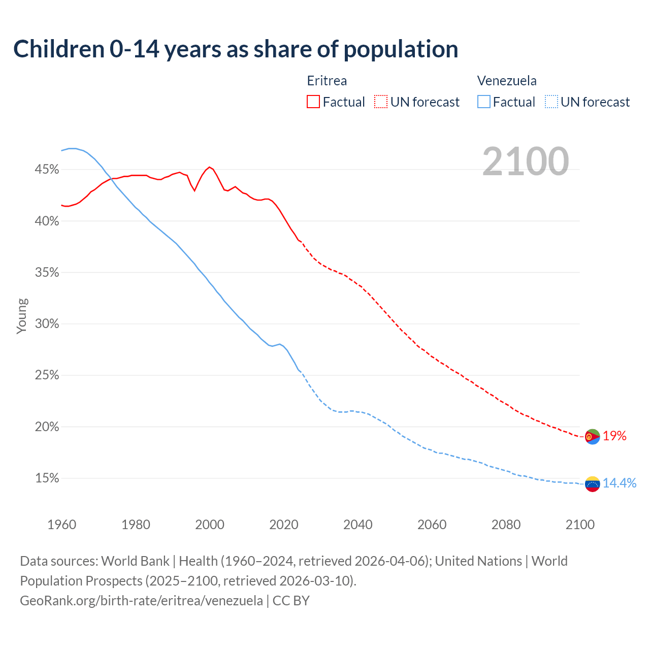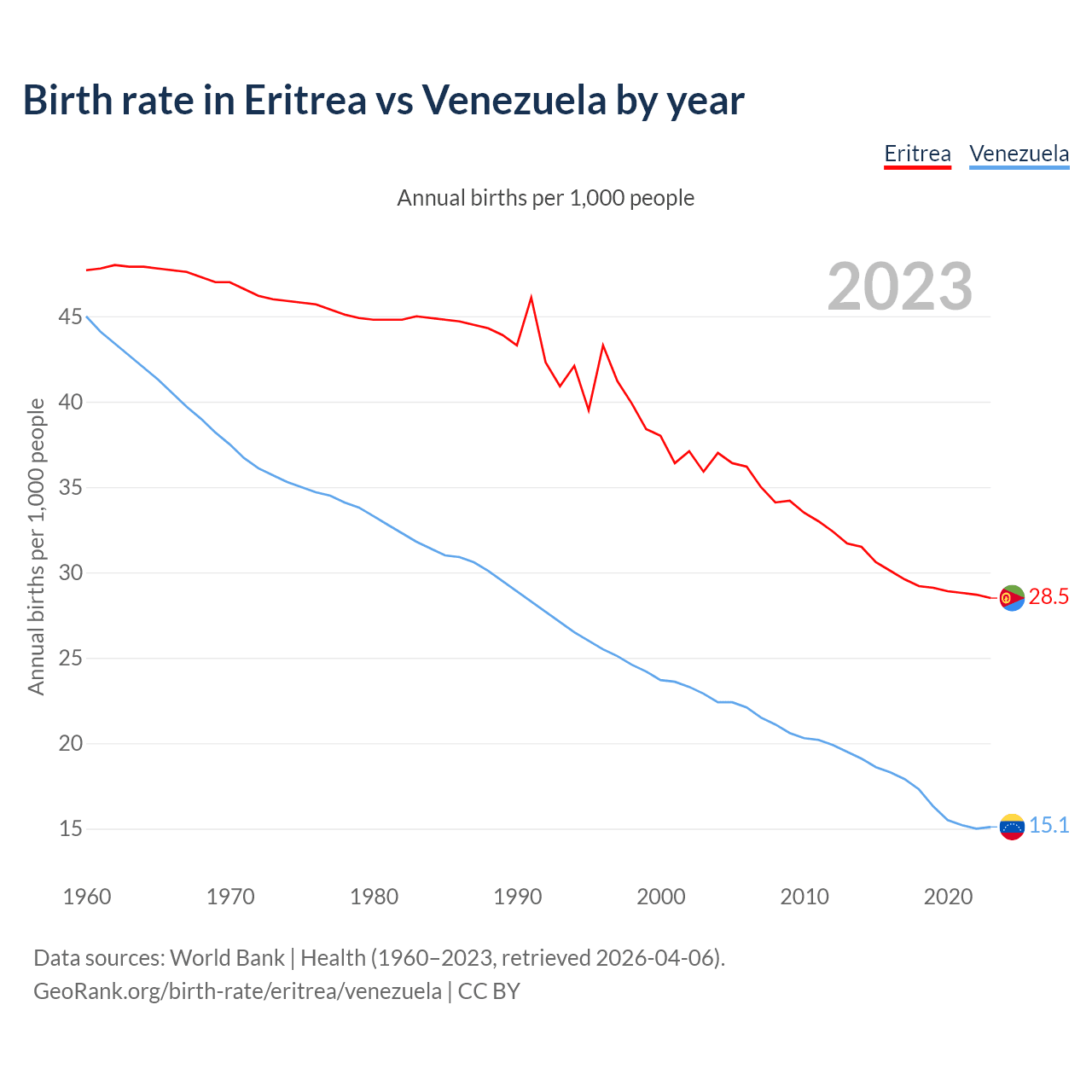 Eritrea has an annual birth rate of 28.5 births per 1,000 people, compared to 15.1 for Venezuela. The average number of children a woman is expected to have during her lifetime — the fertility rate, is 3.71 in Eritrea and 2.08 in Venezuela — 44% difference.