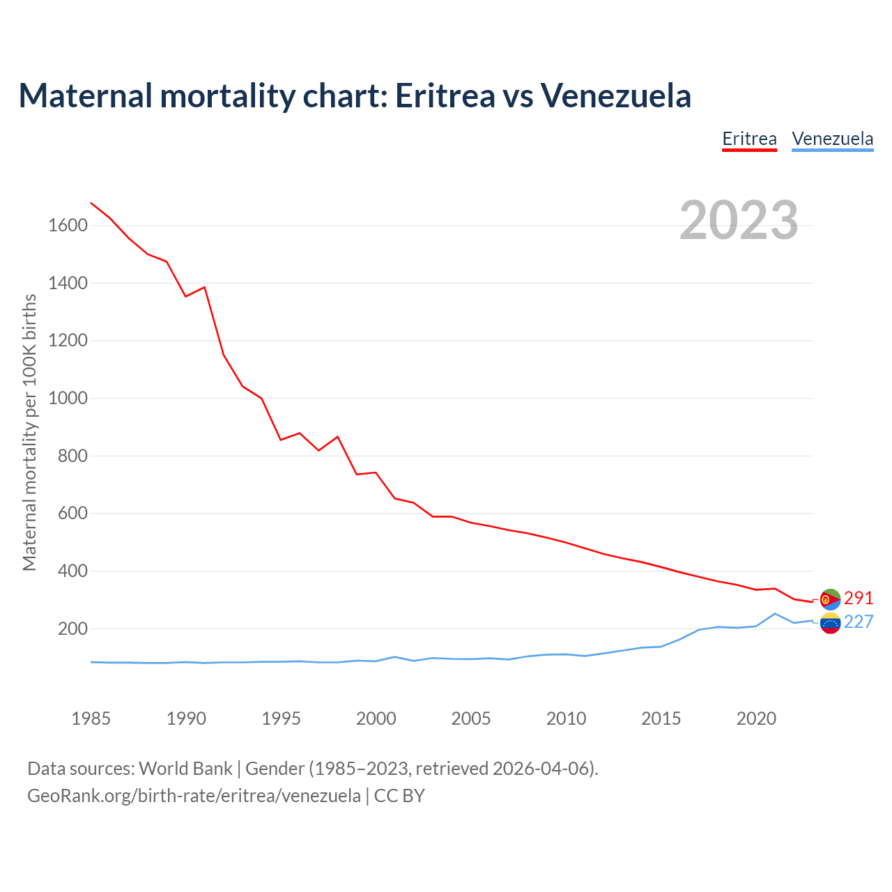 The maternal mortality rate, which is the probability of dying during childbirth or within 42 days of pregnancy termination, is 291 deaths per 100,000 live births in Eritrea, compared to 227 deaths in Venezuela.