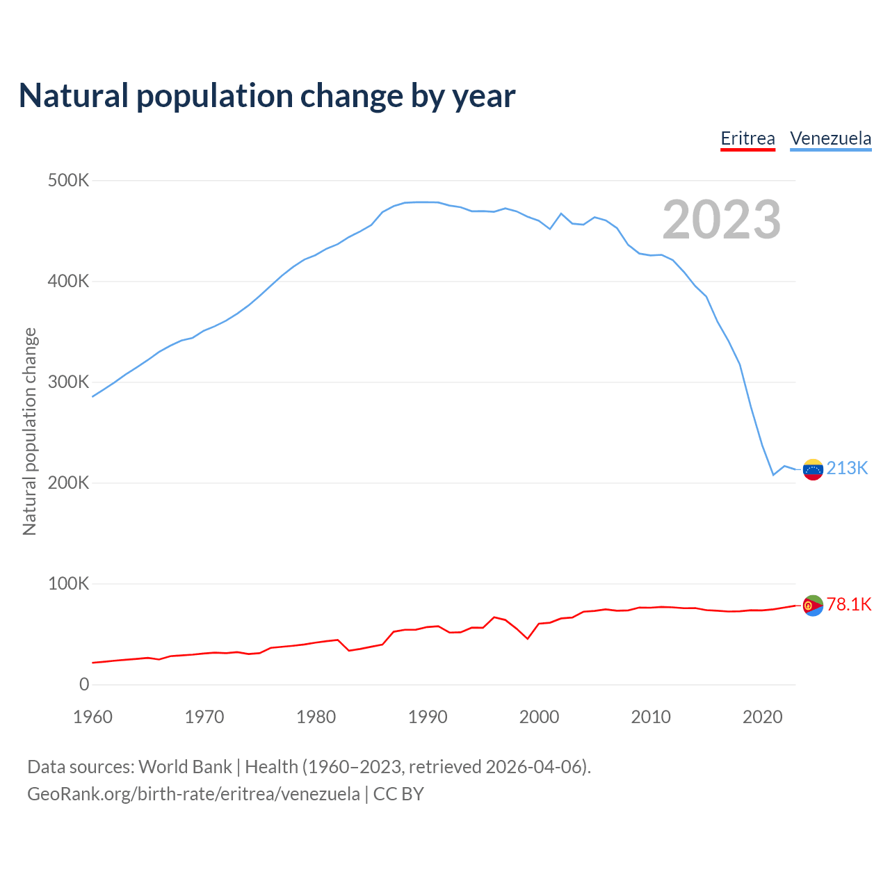 According to the latest available data on birth rates, the fertility rate in Eritrea was 3.71 children per woman in 2023, compared to 2.08 in Venezuela in 2023. The replacement level is considered to be 2.1 children per woman.