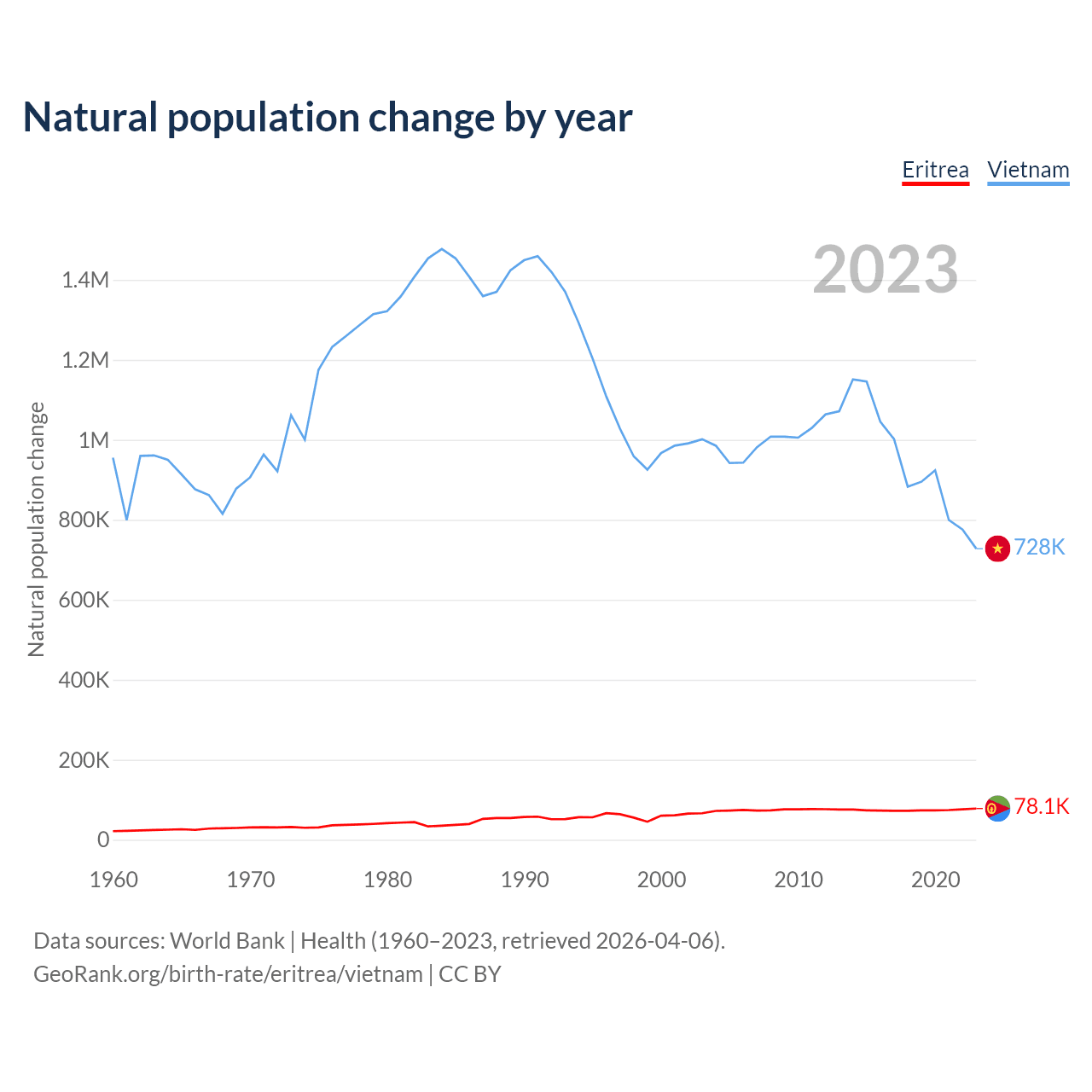 According to the latest available data on birth rates, the fertility rate in Eritrea was 3.71 children per woman in 2023, compared to 1.91 in Vietnam in 2023. The replacement level is considered to be 2.1 children per woman.