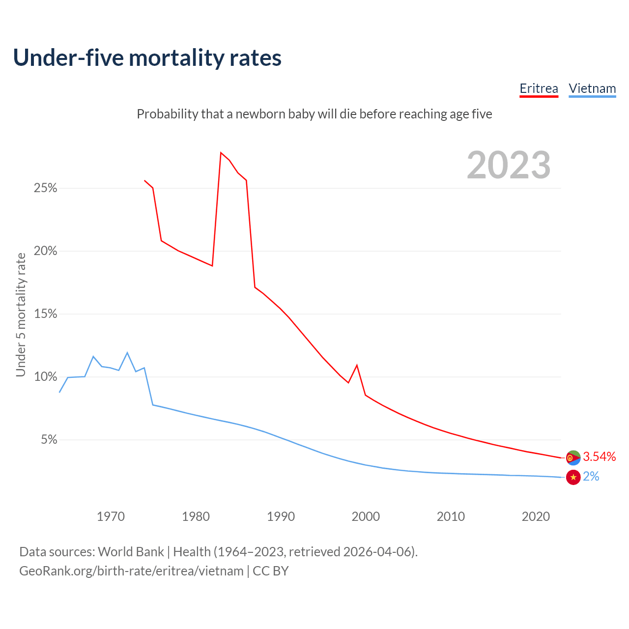 The chance that a newborn baby will die before reaching age five is 3.54% in Eritrea and 2% in Vietnam. Above is a chart with historical data on under-five mortality rates.