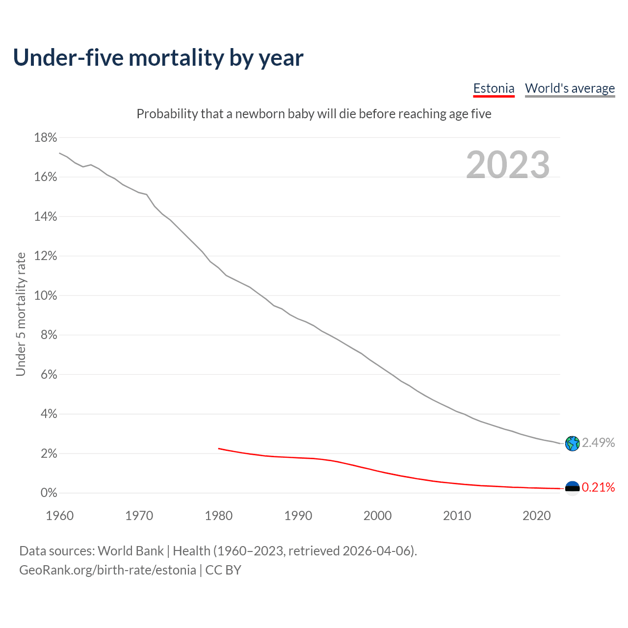 The under-5 mortality rate in Estonia was 2.1 deaths per 1,000 live births in 2023 — a 0.21% chance that a newborn baby will die before reaching age five. This is down from 11 deaths per 1,000 live births in 2000.