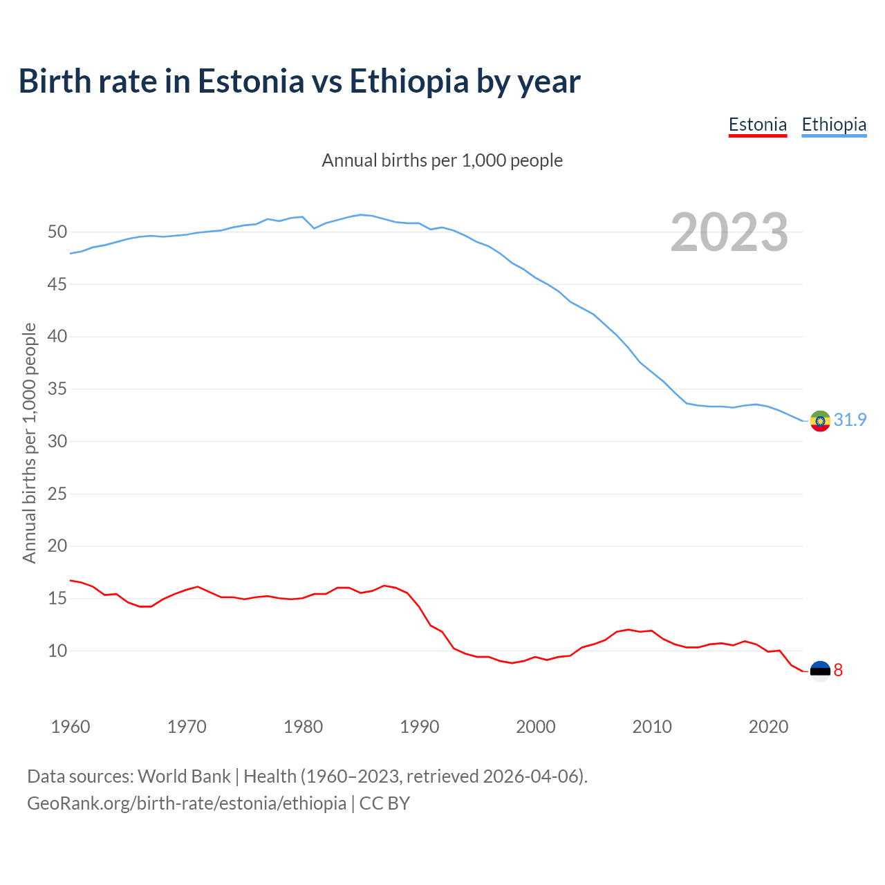Estonia has an annual birth rate of 8 births per 1,000 people, compared to 31.9 for Ethiopia. The average number of children a woman is expected to have during her lifetime — the fertility rate, is 1.31 in Estonia and 3.99 in Ethiopia — 204.5% difference.