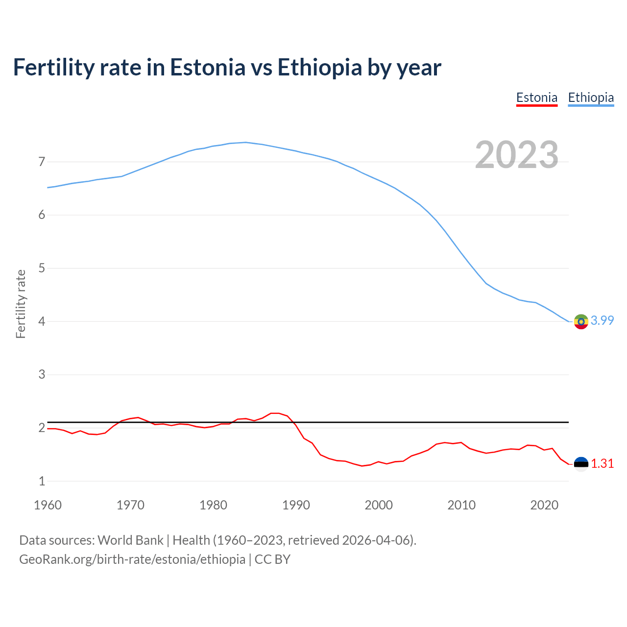 According to the latest available data on birth rates, the fertility rate in Estonia was 1.31 children per woman in 2023, compared to 3.99 in Ethiopia in 2023. The replacement level is considered to be 2.1 children per woman.