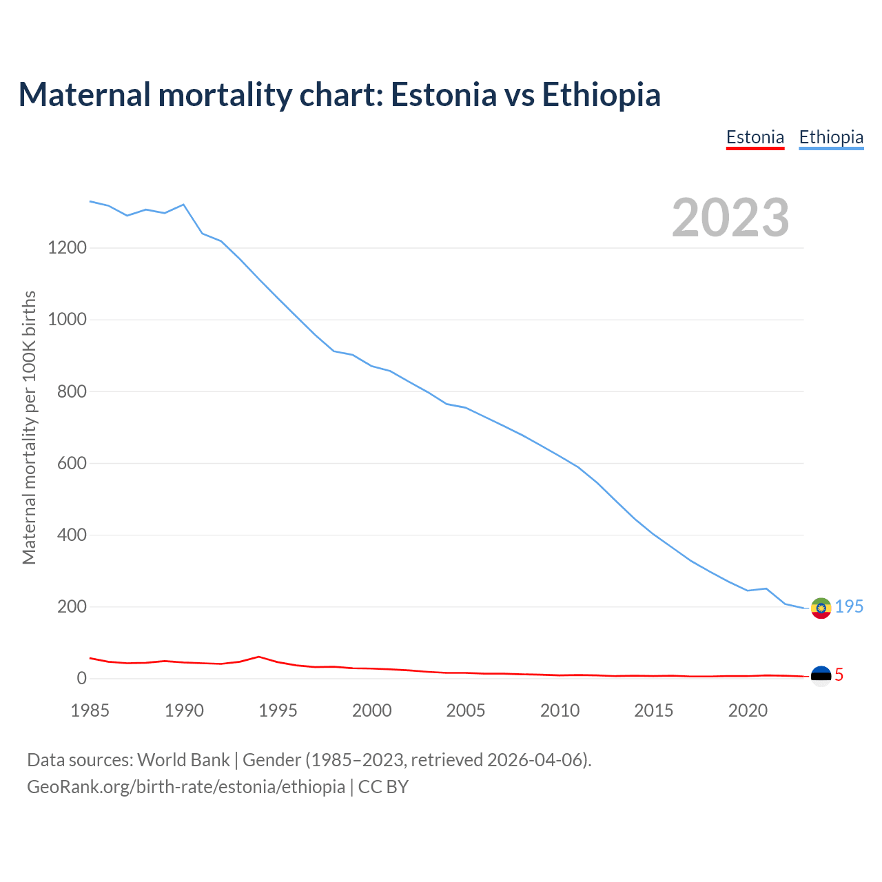 The maternal mortality rate, which is the probability of dying during childbirth or within 42 days of pregnancy termination, is 5 deaths per 100,000 live births in Estonia, compared to 195 deaths in Ethiopia.