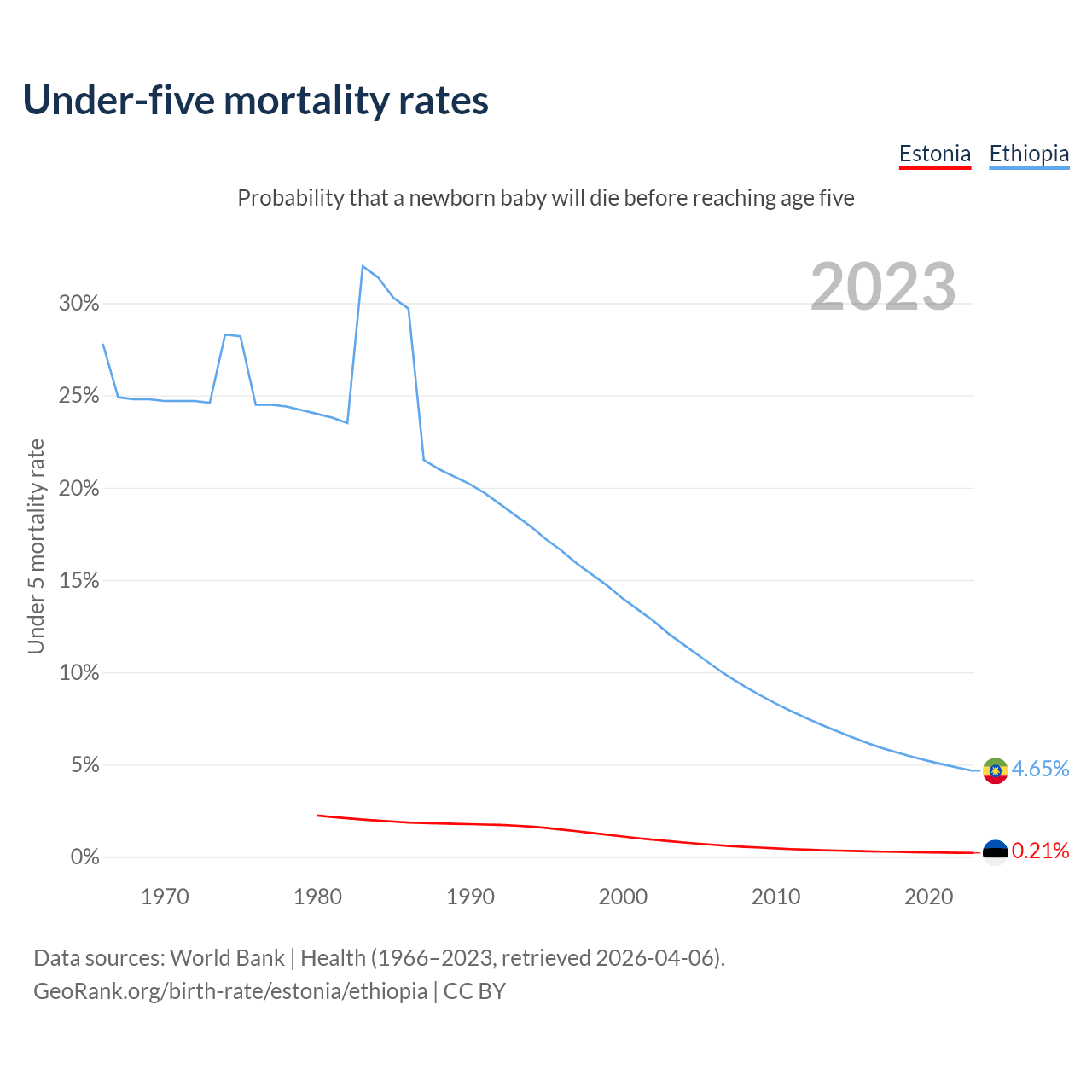 The chance that a newborn baby will die before reaching age five is 0.21% in Estonia and 4.65% in Ethiopia. Above is a chart with historical data on under-five mortality rates.
