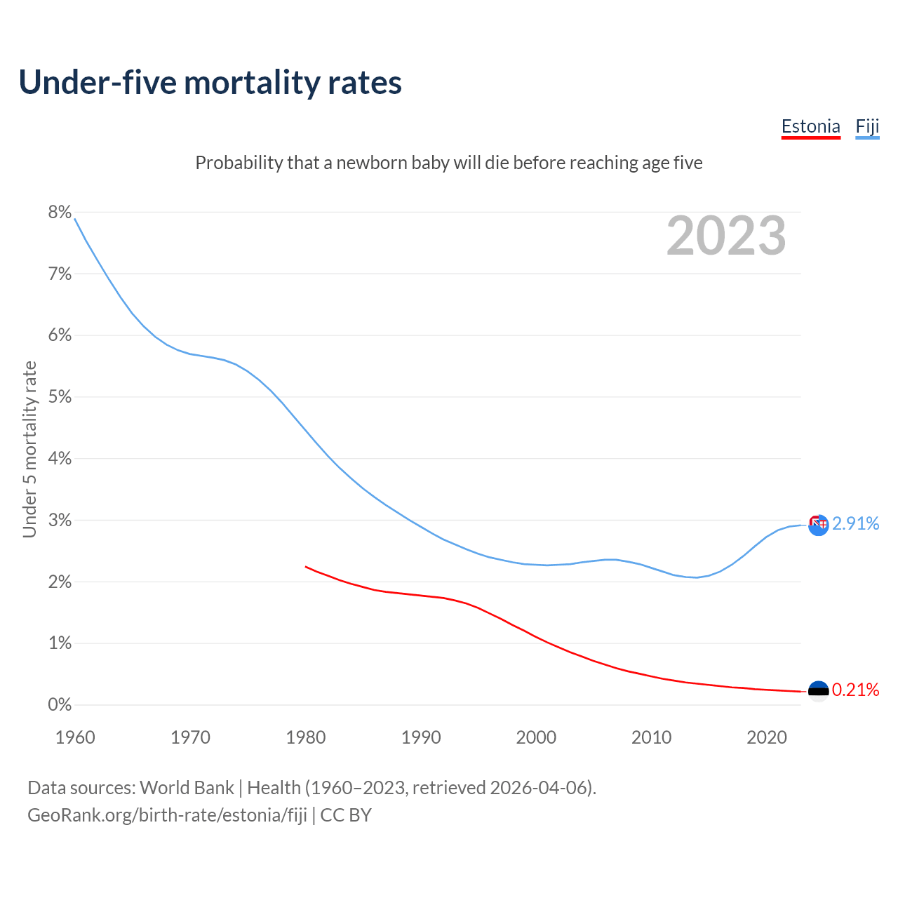 The chance that a newborn baby will die before reaching age five is 0.21% in Estonia and 2.91% in Fiji. Above is a chart with historical data on under-five mortality rates.