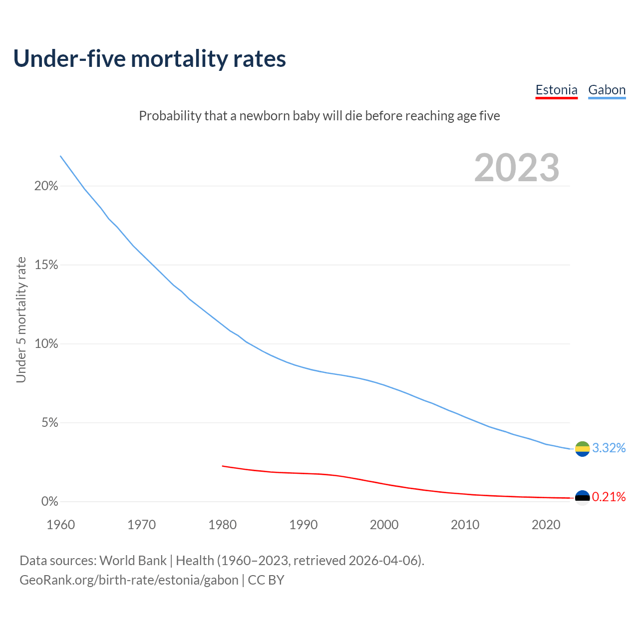 The chance that a newborn baby will die before reaching age five is 0.21% in Estonia and 3.32% in Gabon. Above is a chart with historical data on under-five mortality rates.