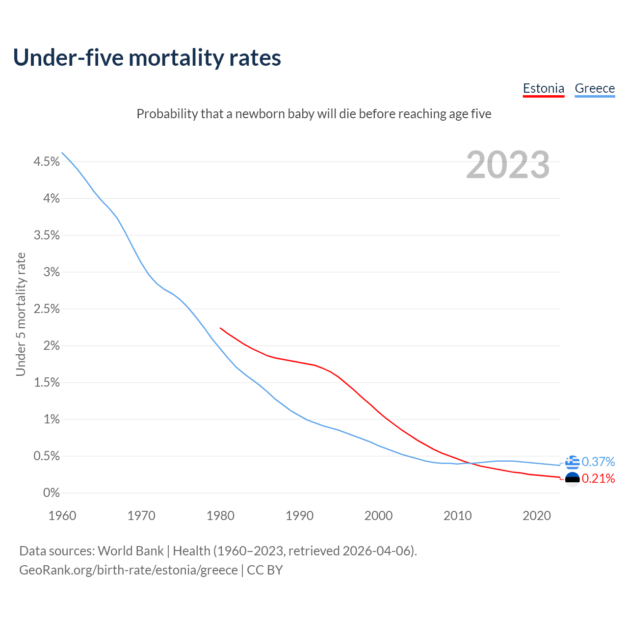 The chance that a newborn baby will die before reaching age five is 0.21% in Estonia and 0.37% in Greece. Above is a chart with historical data on under-five mortality rates.