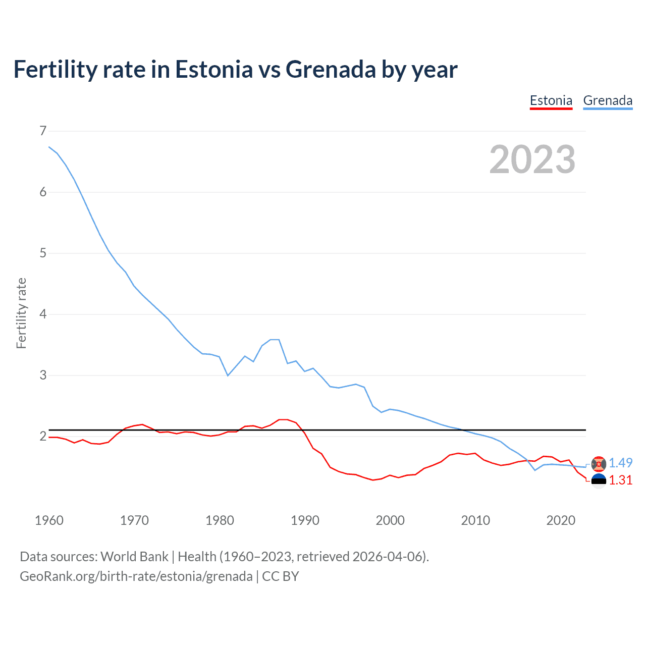 According to the latest available data on birth rates, the fertility rate in Estonia was 1.31 children per woman in 2023, compared to 1.49 in Grenada in 2023. The replacement level is considered to be 2.1 children per woman.