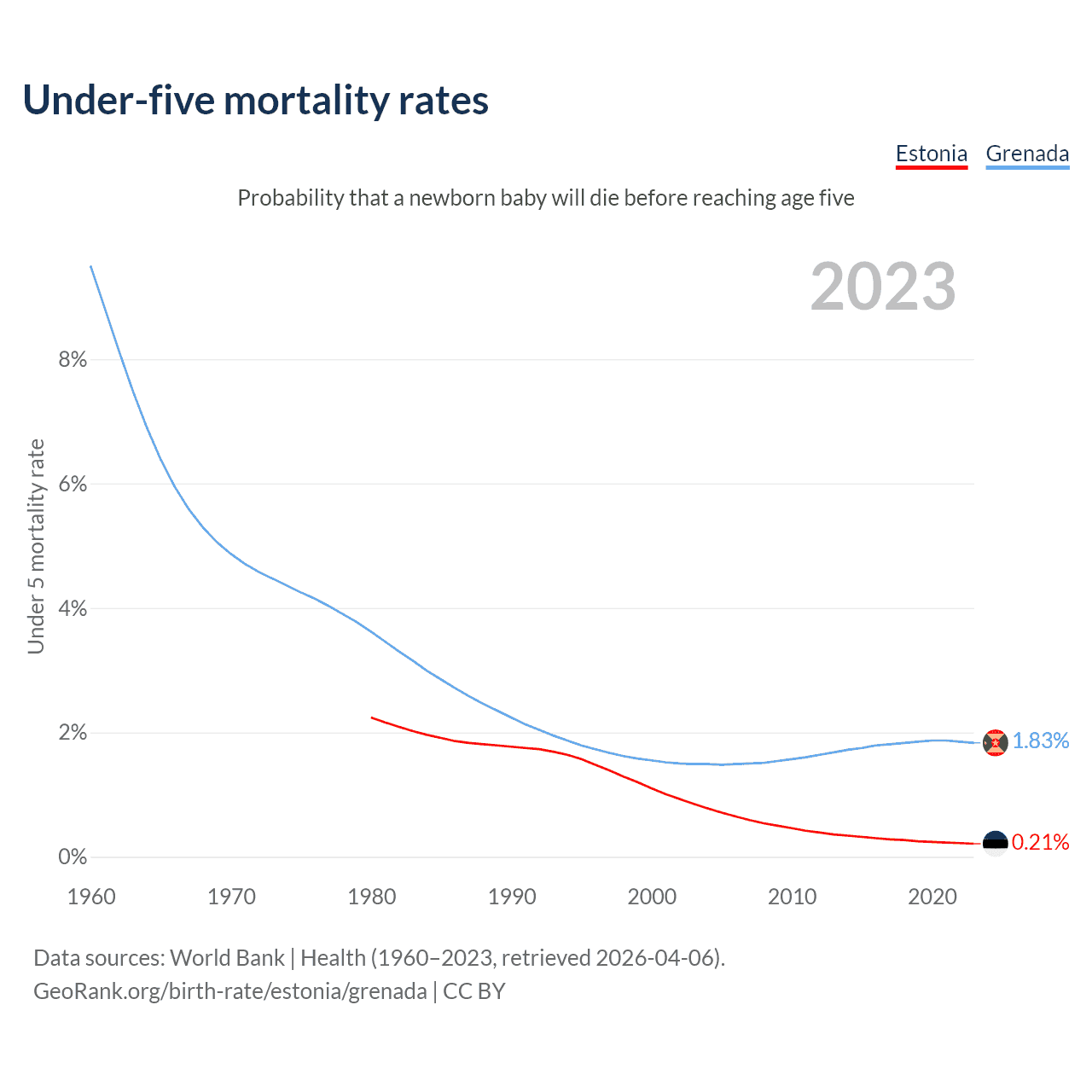 The chance that a newborn baby will die before reaching age five is 0.21% in Estonia and 1.83% in Grenada. Above is a chart with historical data on under-five mortality rates.