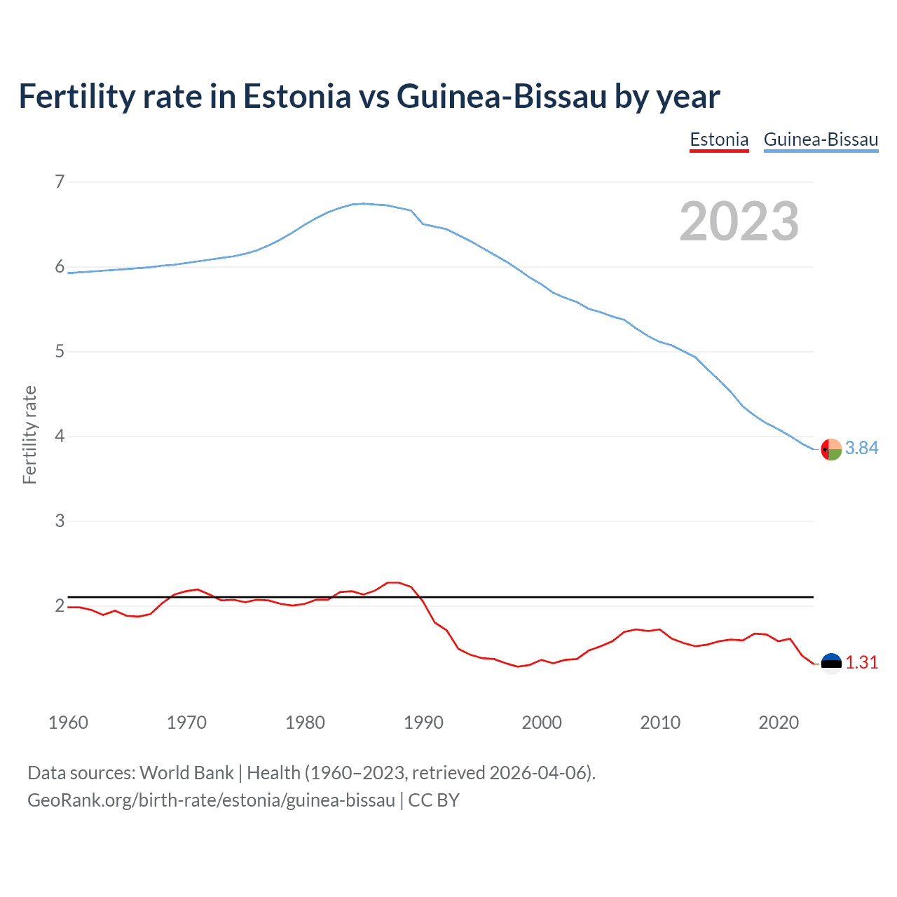 Estonia has an annual birth rate of 8 births per 1,000 people, compared to 30 for Guinea-Bissau. The average number of children a woman is expected to have during her lifetime — the fertility rate, is 1.31 in Estonia and 3.84 in Guinea-Bissau — 192.8% difference.