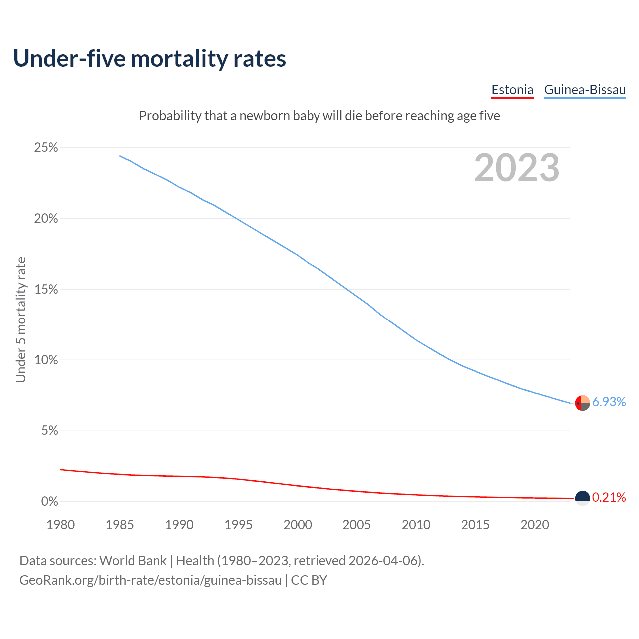 The chance that a newborn baby will die before reaching age five is 0.21% in Estonia and 6.93% in Guinea-Bissau. Above is a chart with historical data on under-five mortality rates.