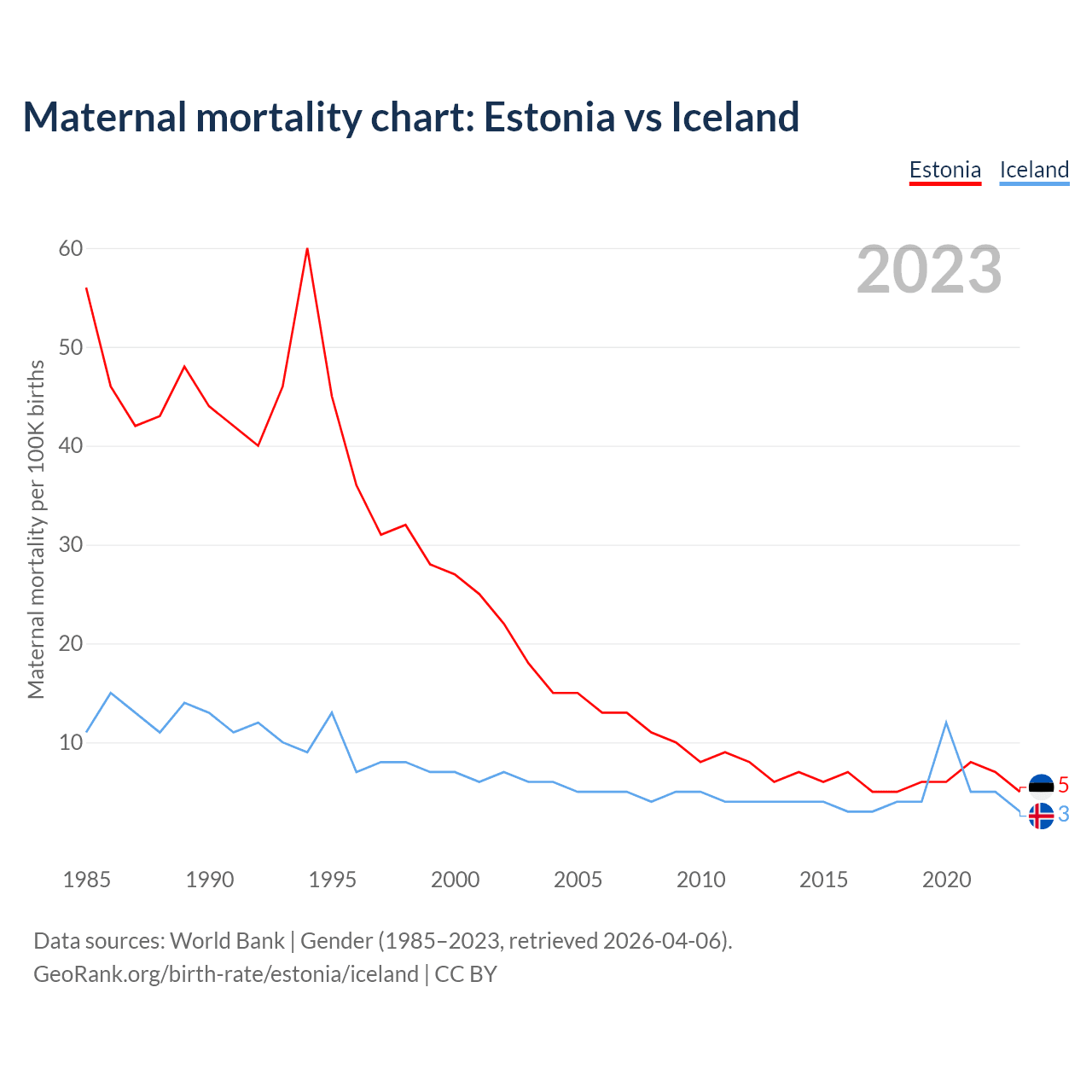 The maternal mortality rate, which is the probability of dying during childbirth or within 42 days of pregnancy termination, is 5 deaths per 100,000 live births in Estonia, compared to 3 deaths in Iceland.