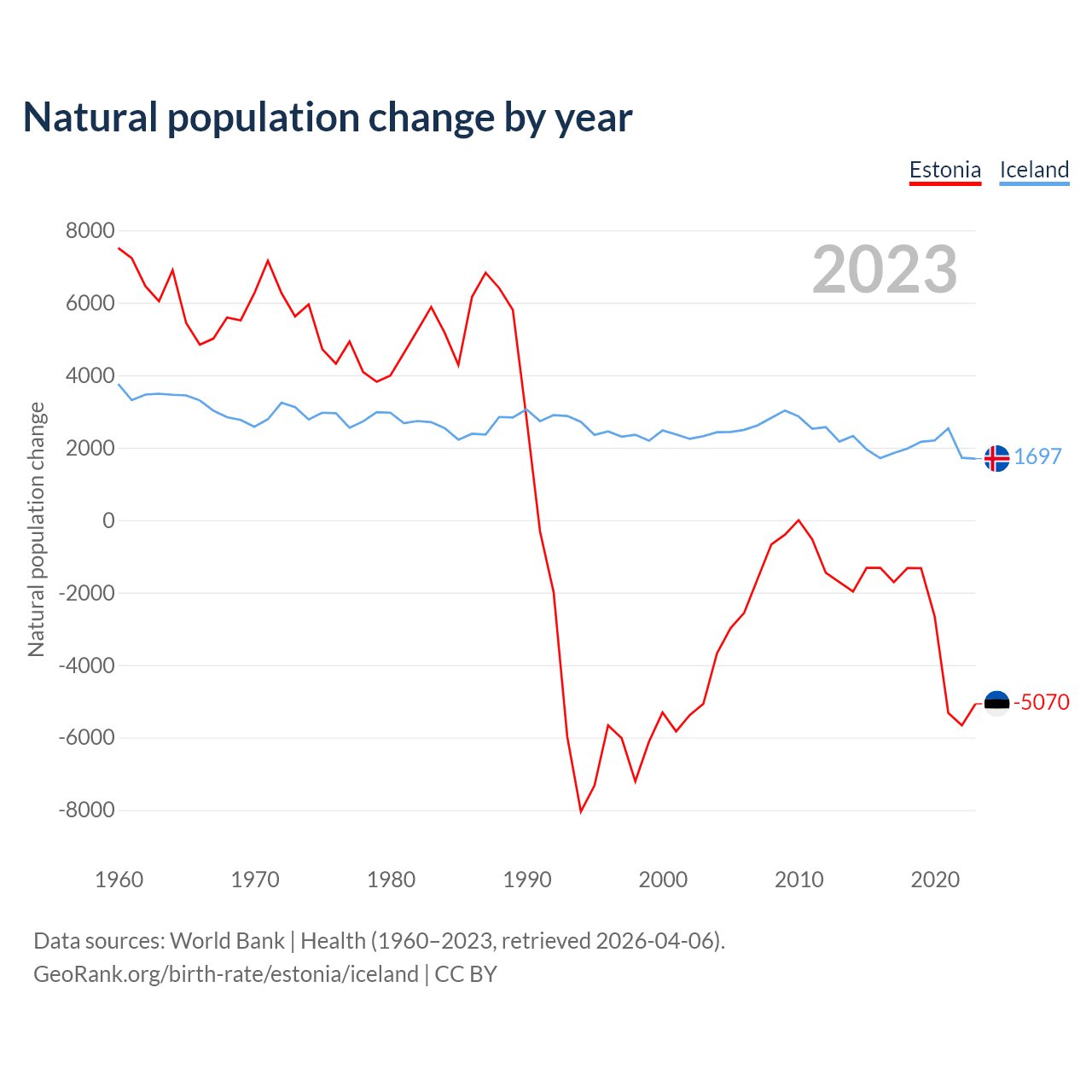 Estonia has an annual birth rate of 8 births per 1,000 people, compared to 11 for Iceland. The average number of children a woman is expected to have during her lifetime — the fertility rate, is 1.31 in Estonia and 1.59 in Iceland — 21.4% difference.