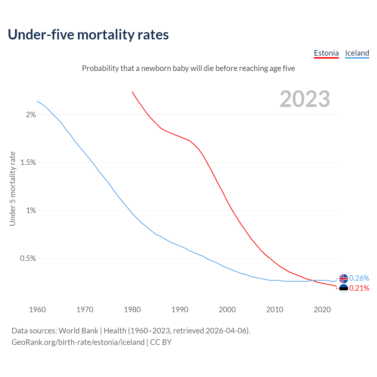 The chance that a newborn baby will die before reaching age five is 0.21% in Estonia and 0.26% in Iceland. Above is a chart with historical data on under-five mortality rates.