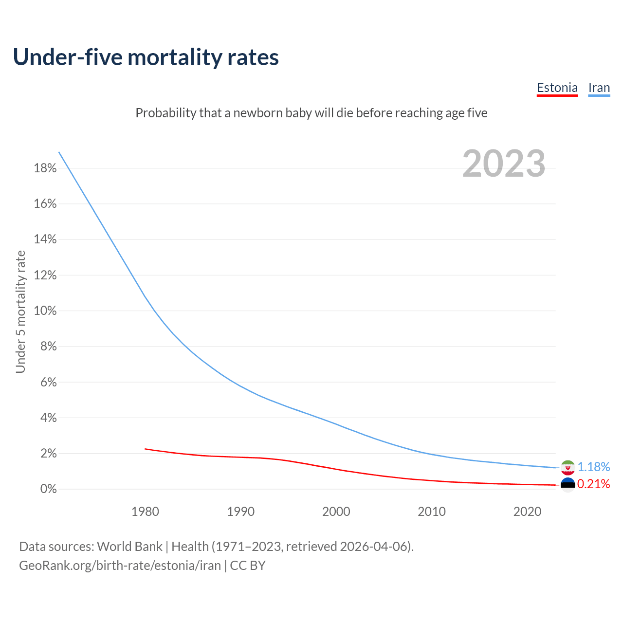 The chance that a newborn baby will die before reaching age five is 0.21% in Estonia and 1.18% in Iran. Above is a chart with historical data on under-five mortality rates.