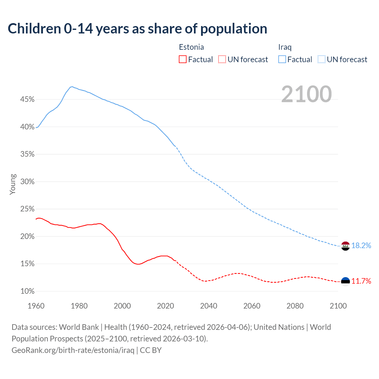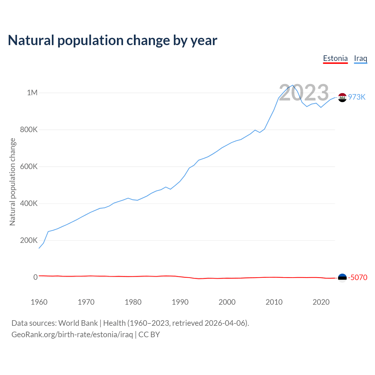 Estonia has an annual birth rate of 8 births per 1,000 people, compared to 25.7 for Iraq. The average number of children a woman is expected to have during her lifetime — the fertility rate, is 1.31 in Estonia and 3.25 in Iraq — 148% difference.