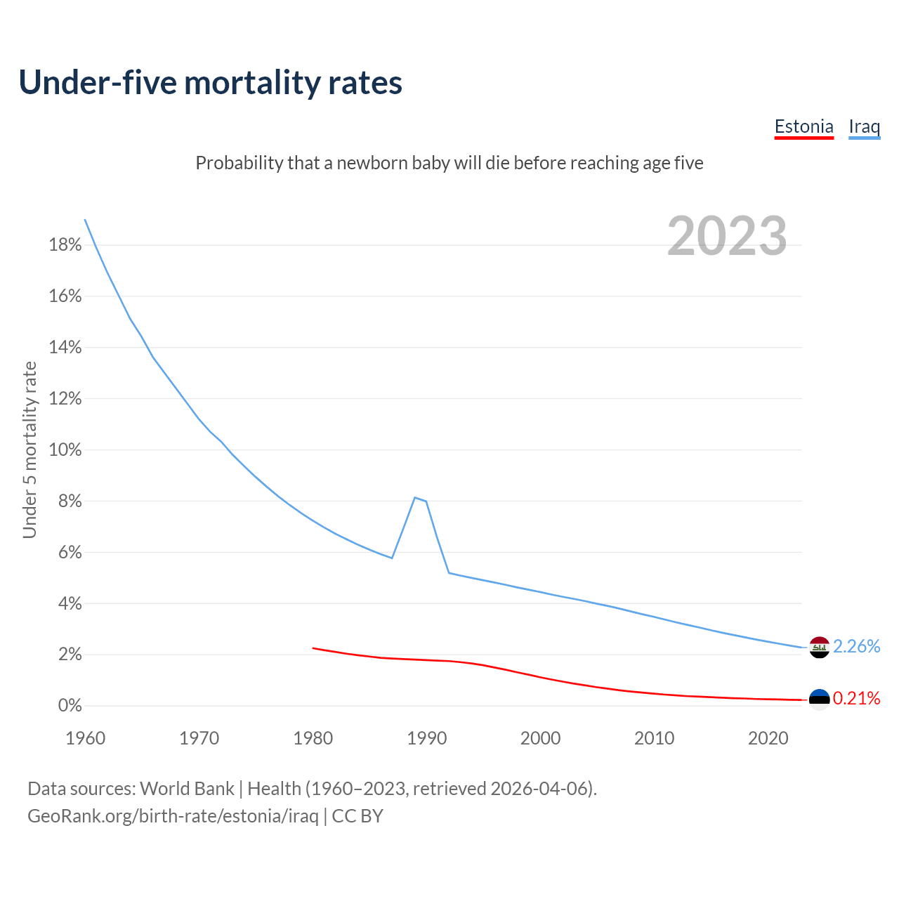 The chance that a newborn baby will die before reaching age five is 0.21% in Estonia and 2.26% in Iraq. Above is a chart with historical data on under-five mortality rates.