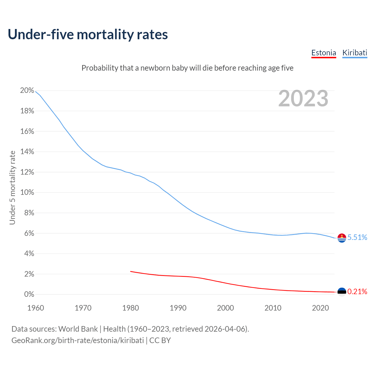 The chance that a newborn baby will die before reaching age five is 0.21% in Estonia and 5.51% in Kiribati. Above is a chart with historical data on under-five mortality rates.