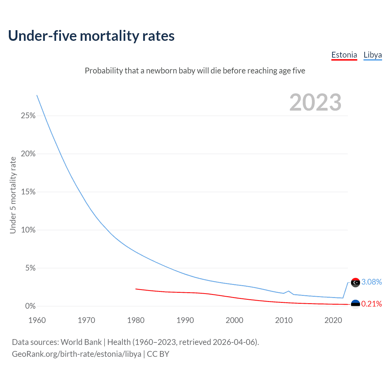 The chance that a newborn baby will die before reaching age five is 0.21% in Estonia and 3.08% in Libya. Above is a chart with historical data on under-five mortality rates.