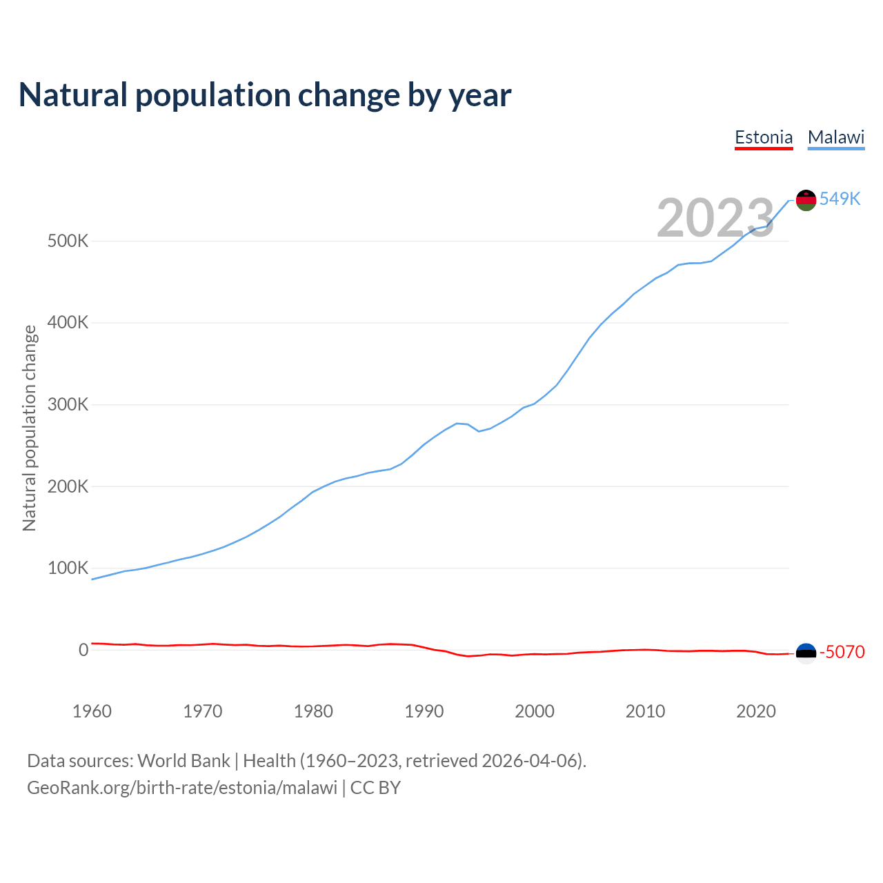 Estonia has an annual birth rate of 8 births per 1,000 people, compared to 31.4 for Malawi. The average number of children a woman is expected to have during her lifetime — the fertility rate, is 1.31 in Estonia and 3.65 in Malawi — 178.5% difference.