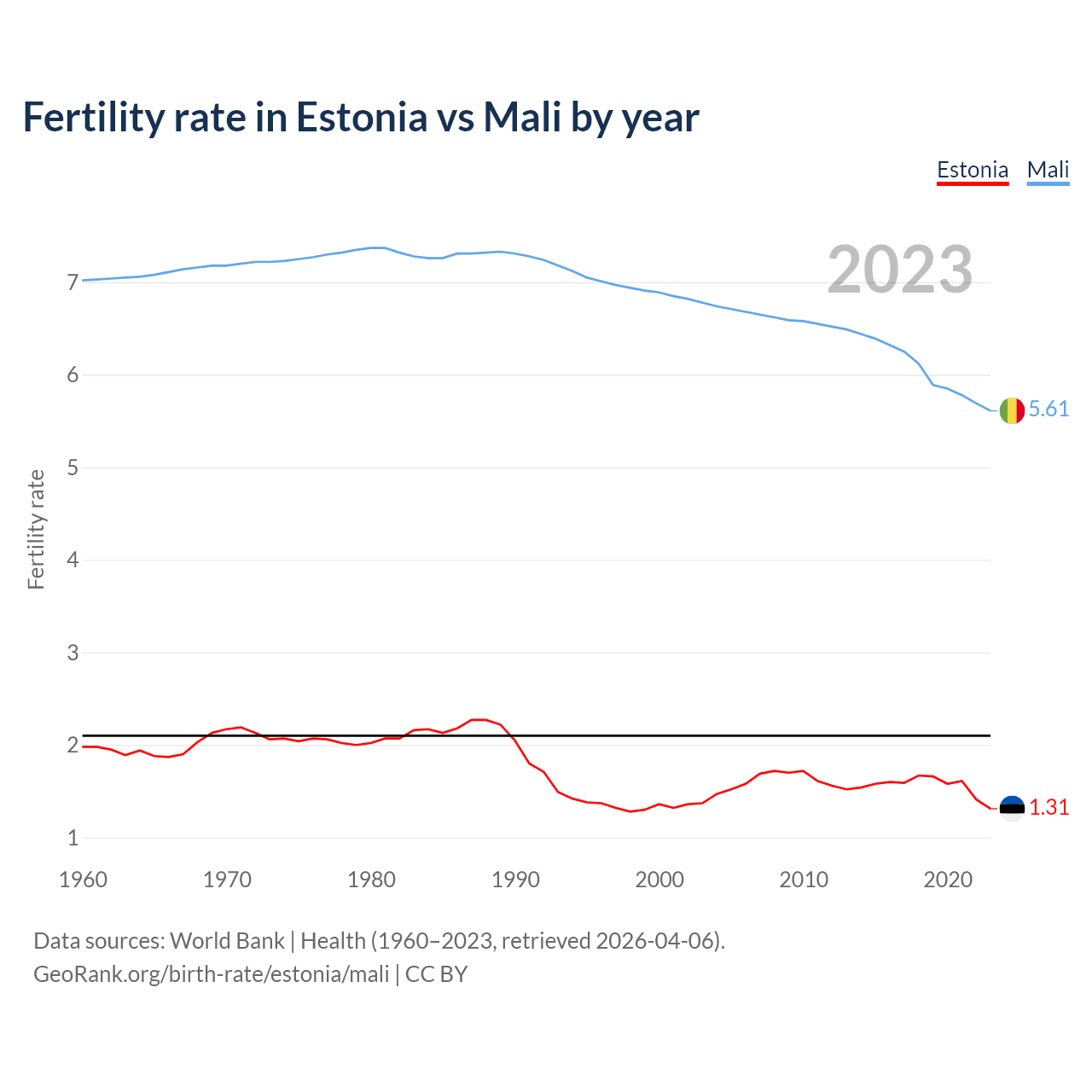 According to the latest available data on birth rates, the fertility rate in Estonia was 1.31 children per woman in 2023, compared to 5.61 in Mali in 2023. The replacement level is considered to be 2.1 children per woman.