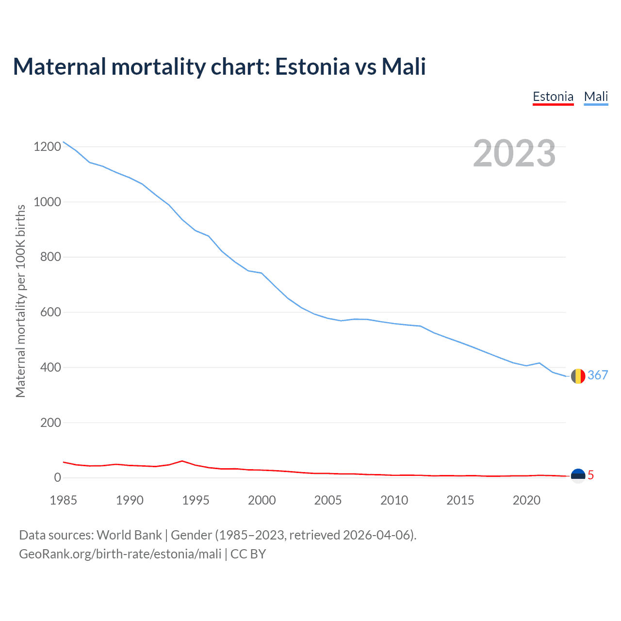 The maternal mortality rate, which is the probability of dying during childbirth or within 42 days of pregnancy termination, is 5 deaths per 100,000 live births in Estonia, compared to 367 deaths in Mali.