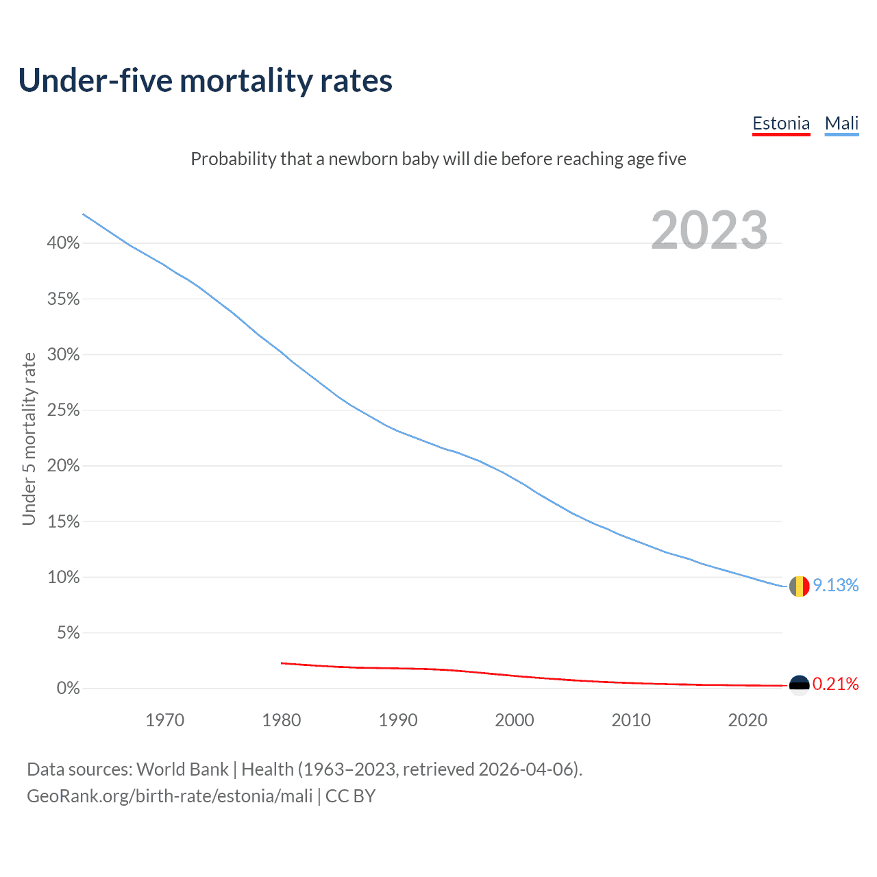The chance that a newborn baby will die before reaching age five is 0.21% in Estonia and 9.13% in Mali. Above is a chart with historical data on under-five mortality rates.