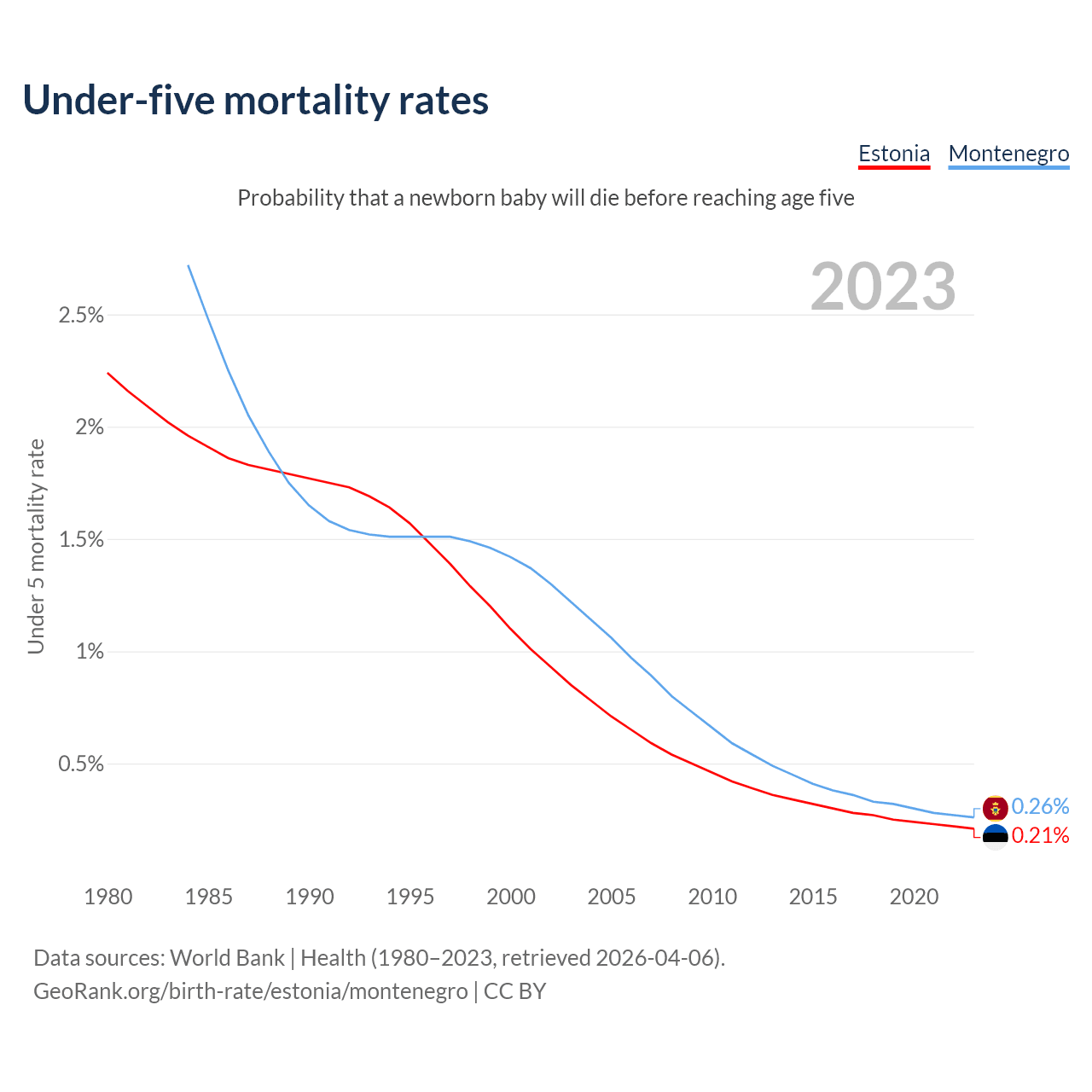 The chance that a newborn baby will die before reaching age five is 0.21% in Estonia and 0.26% in Montenegro. Above is a chart with historical data on under-five mortality rates.