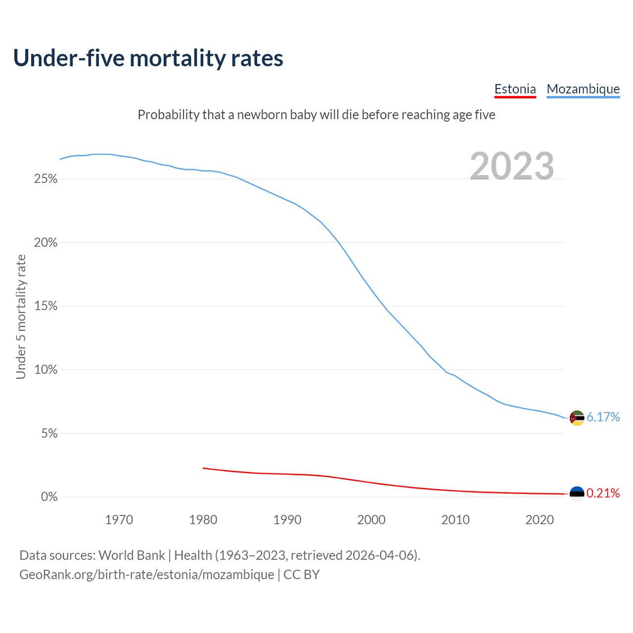 The chance that a newborn baby will die before reaching age five is 0.21% in Estonia and 6.17% in Mozambique. Above is a chart with historical data on under-five mortality rates.