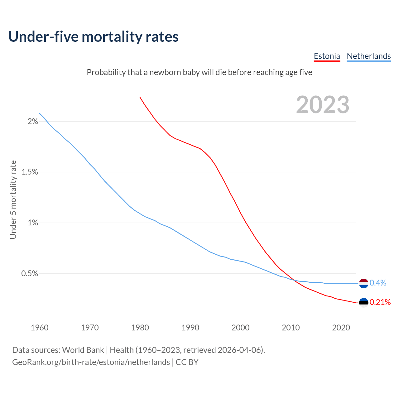 The chance that a newborn baby will die before reaching age five is 0.21% in Estonia and 0.4% in the Netherlands. Above is a chart with historical data on under-five mortality rates.