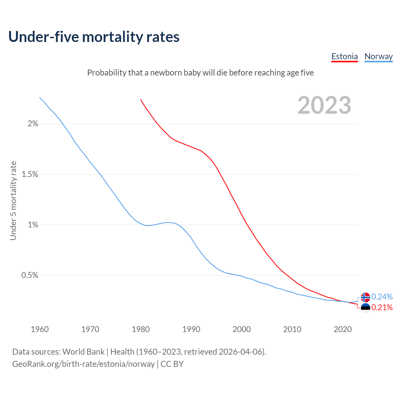 The chance that a newborn baby will die before reaching age five is 0.21% in Estonia and 0.24% in Norway. Above is a chart with historical data on under-five mortality rates.