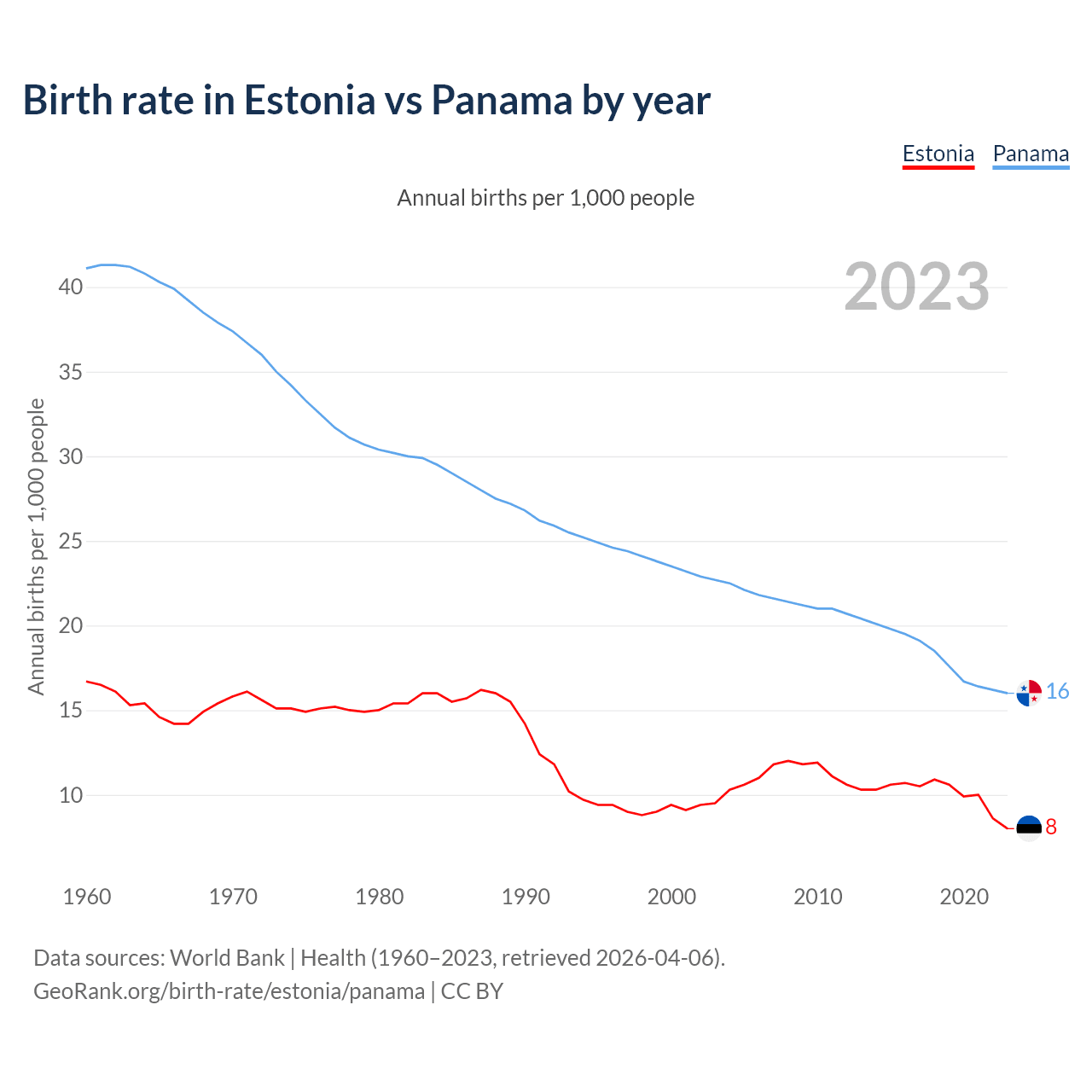 Estonia has an annual birth rate of 8 births per 1,000 people, compared to 16 for Panama. The average number of children a woman is expected to have during her lifetime — the fertility rate, is 1.31 in Estonia and 2.12 in Panama — 61.8% difference.