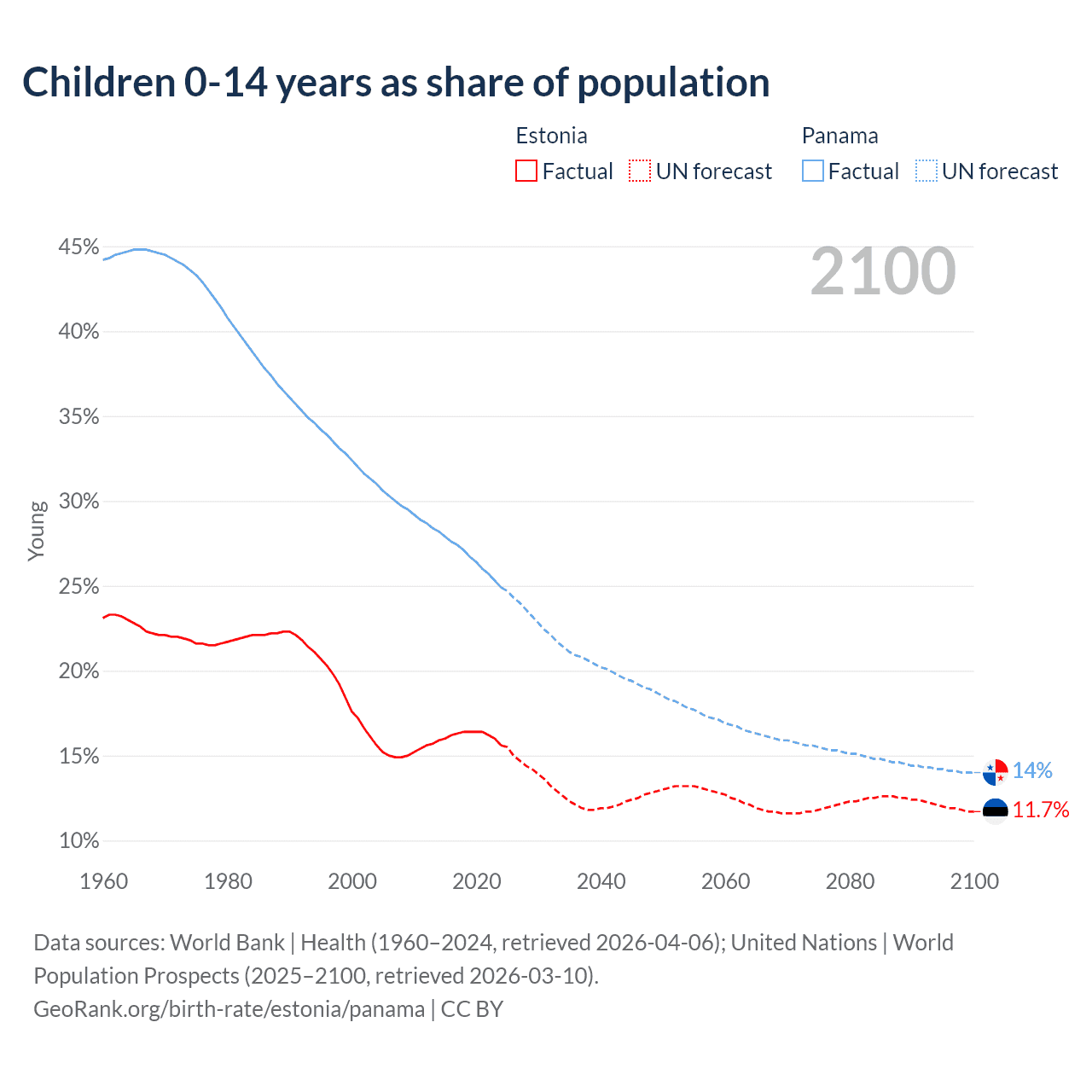 According to the latest available data on birth rates, the fertility rate in Estonia was 1.31 children per woman in 2023, compared to 2.12 in Panama in 2023. The replacement level is considered to be 2.1 children per woman.
