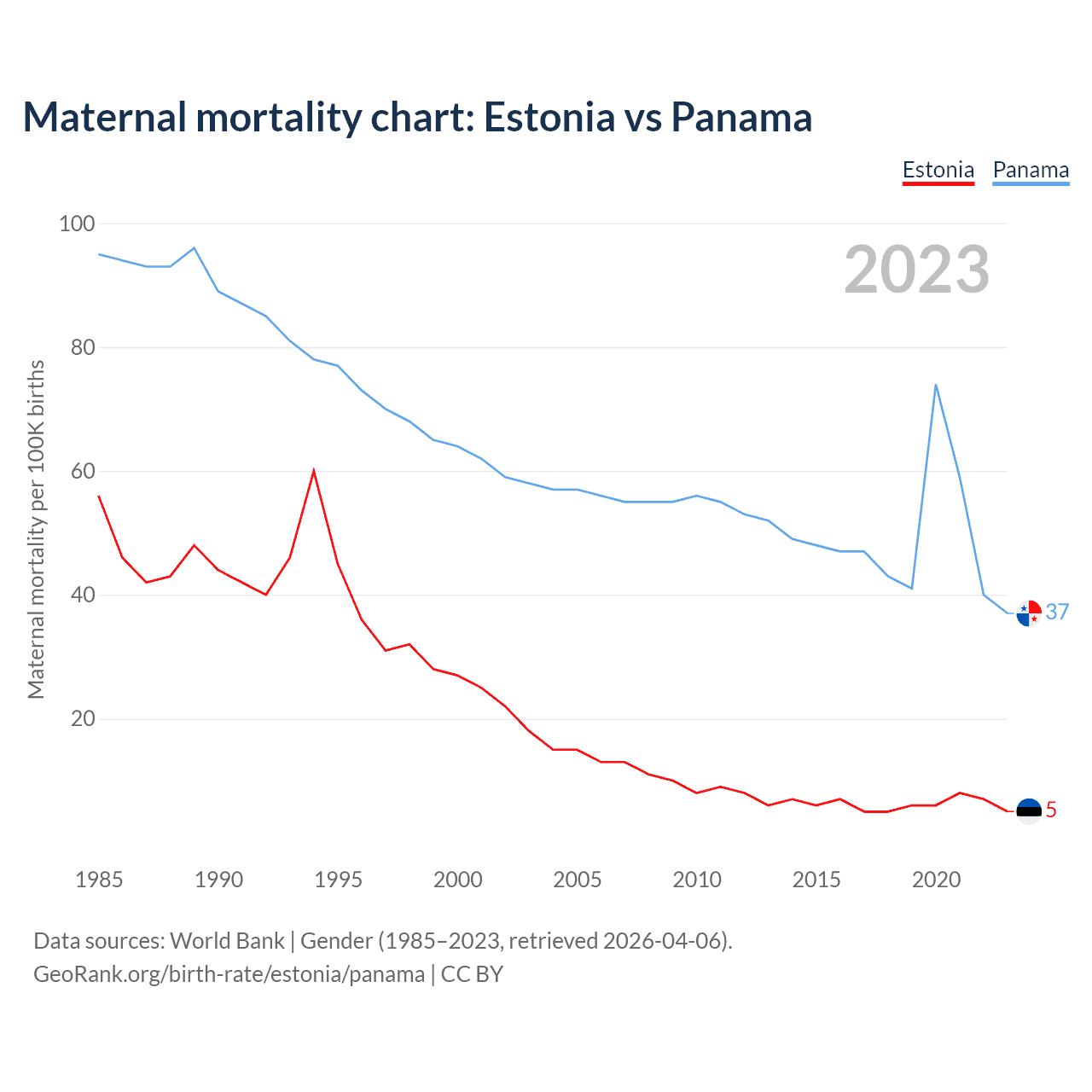 The maternal mortality rate, which is the probability of dying during childbirth or within 42 days of pregnancy termination, is 5 deaths per 100,000 live births in Estonia, compared to 37 deaths in Panama.