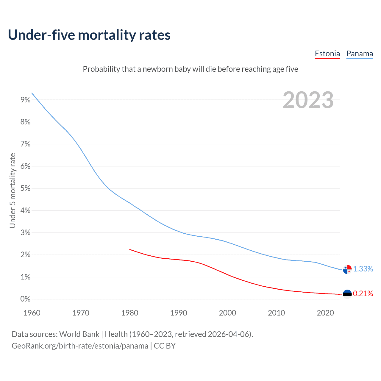 The chance that a newborn baby will die before reaching age five is 0.21% in Estonia and 1.33% in Panama. Above is a chart with historical data on under-five mortality rates.