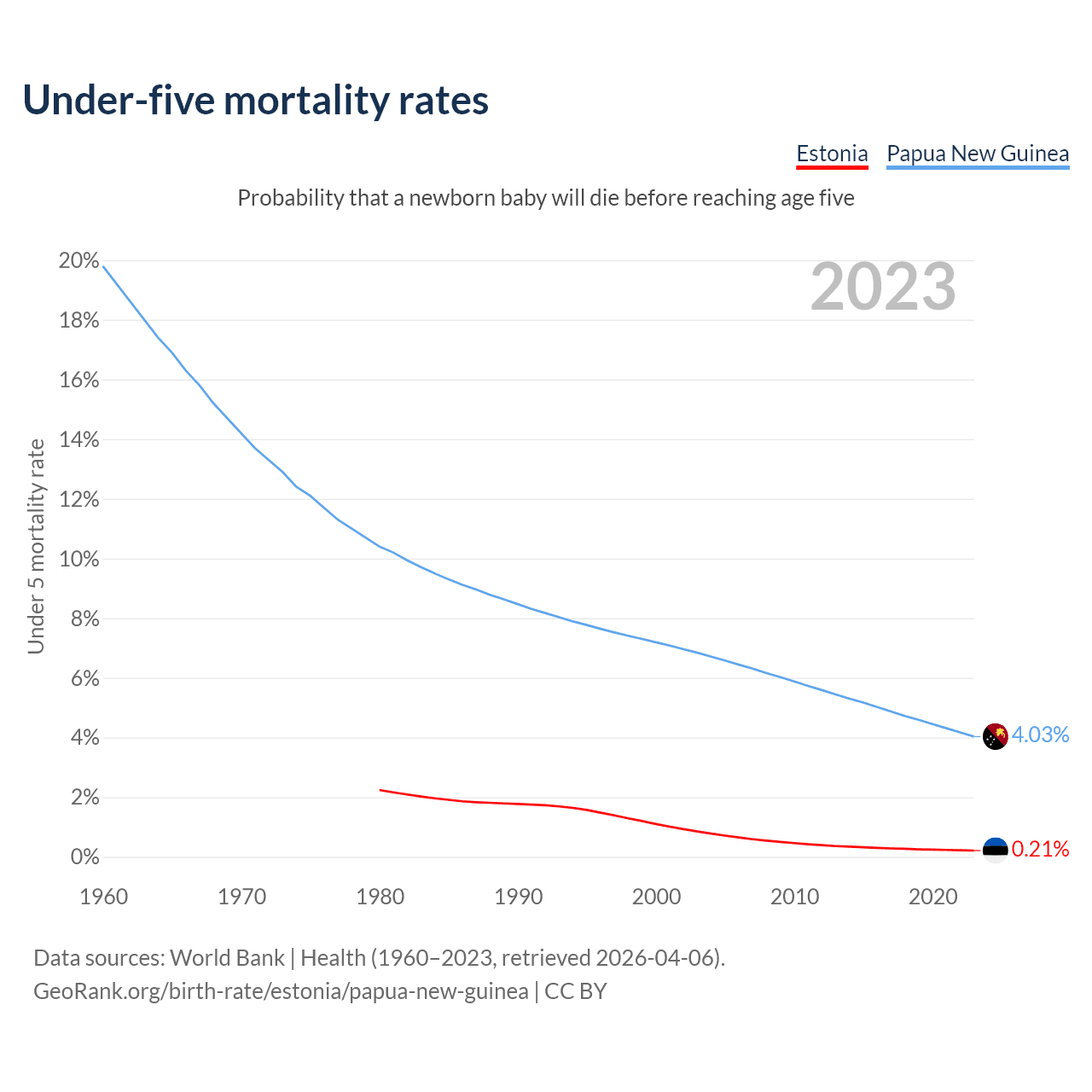 The chance that a newborn baby will die before reaching age five is 0.21% in Estonia and 4.03% in Papua New Guinea. Above is a chart with historical data on under-five mortality rates.