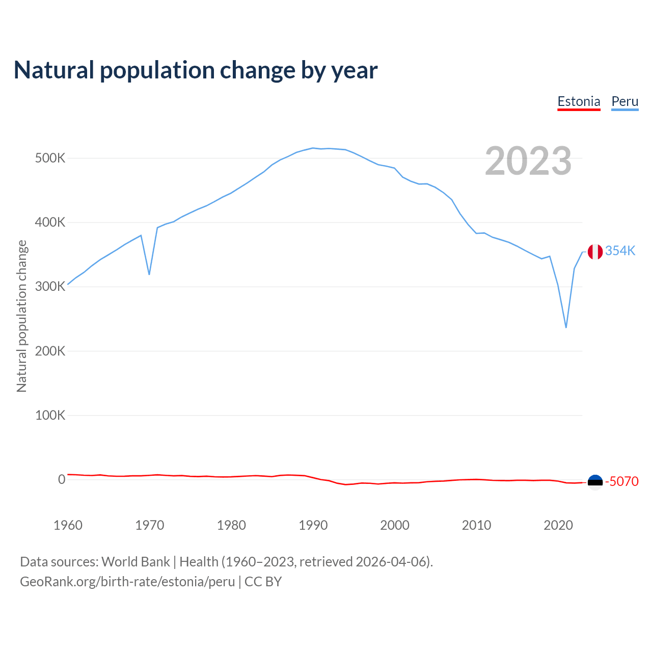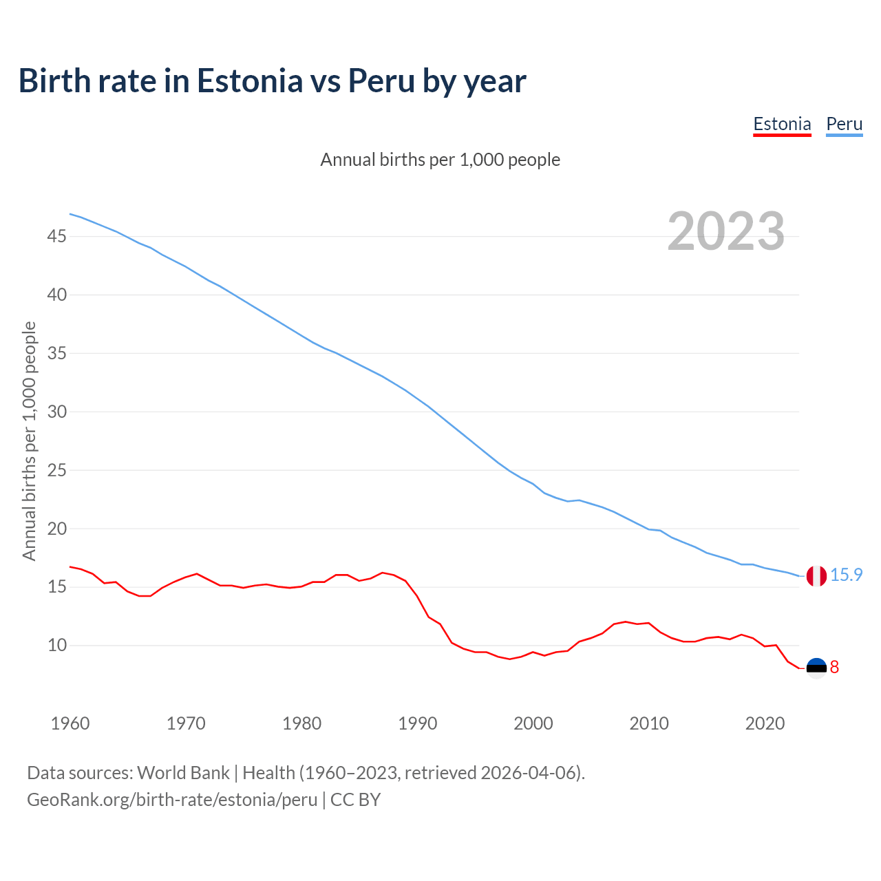 Estonia has an annual birth rate of 8 births per 1,000 people, compared to 15.9 for Peru. The average number of children a woman is expected to have during her lifetime — the fertility rate, is 1.31 in Estonia and 1.98 in Peru — 51.1% difference.