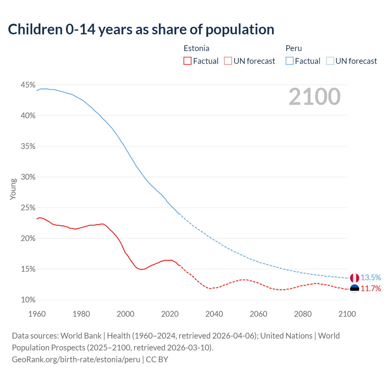 According to the latest available data on birth rates, the fertility rate in Estonia was 1.31 children per woman in 2023, compared to 1.98 in Peru in 2023. The replacement level is considered to be 2.1 children per woman.