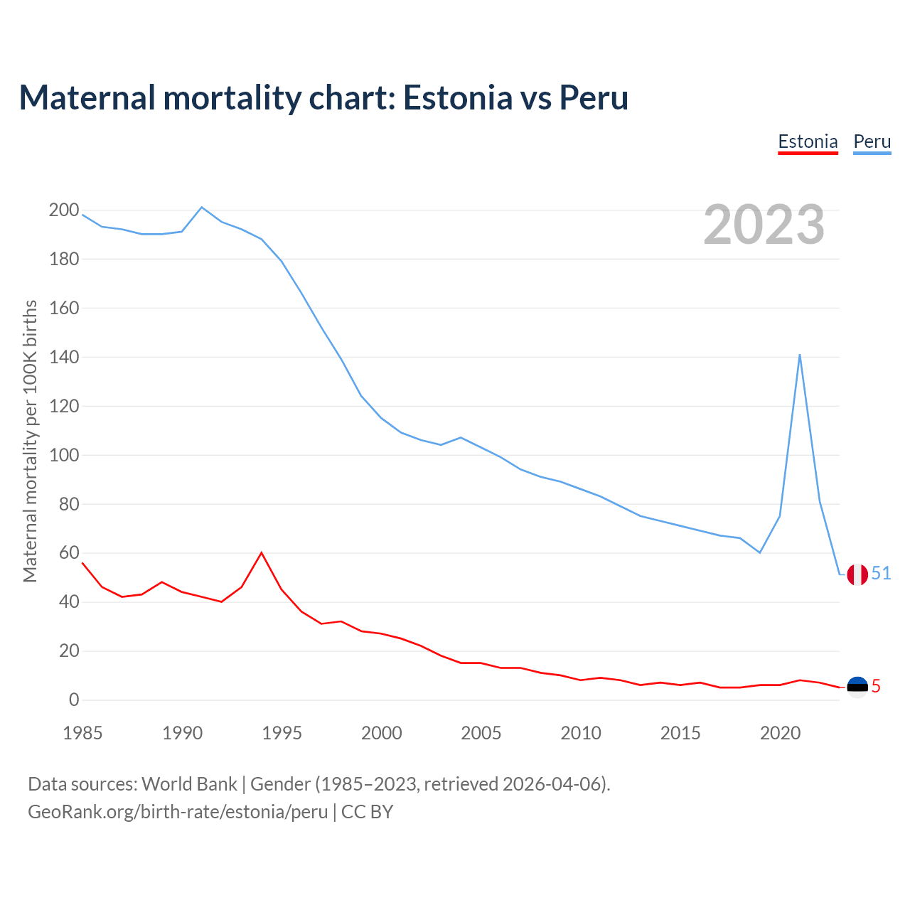 The maternal mortality rate, which is the probability of dying during childbirth or within 42 days of pregnancy termination, is 5 deaths per 100,000 live births in Estonia, compared to 51 deaths in Peru.