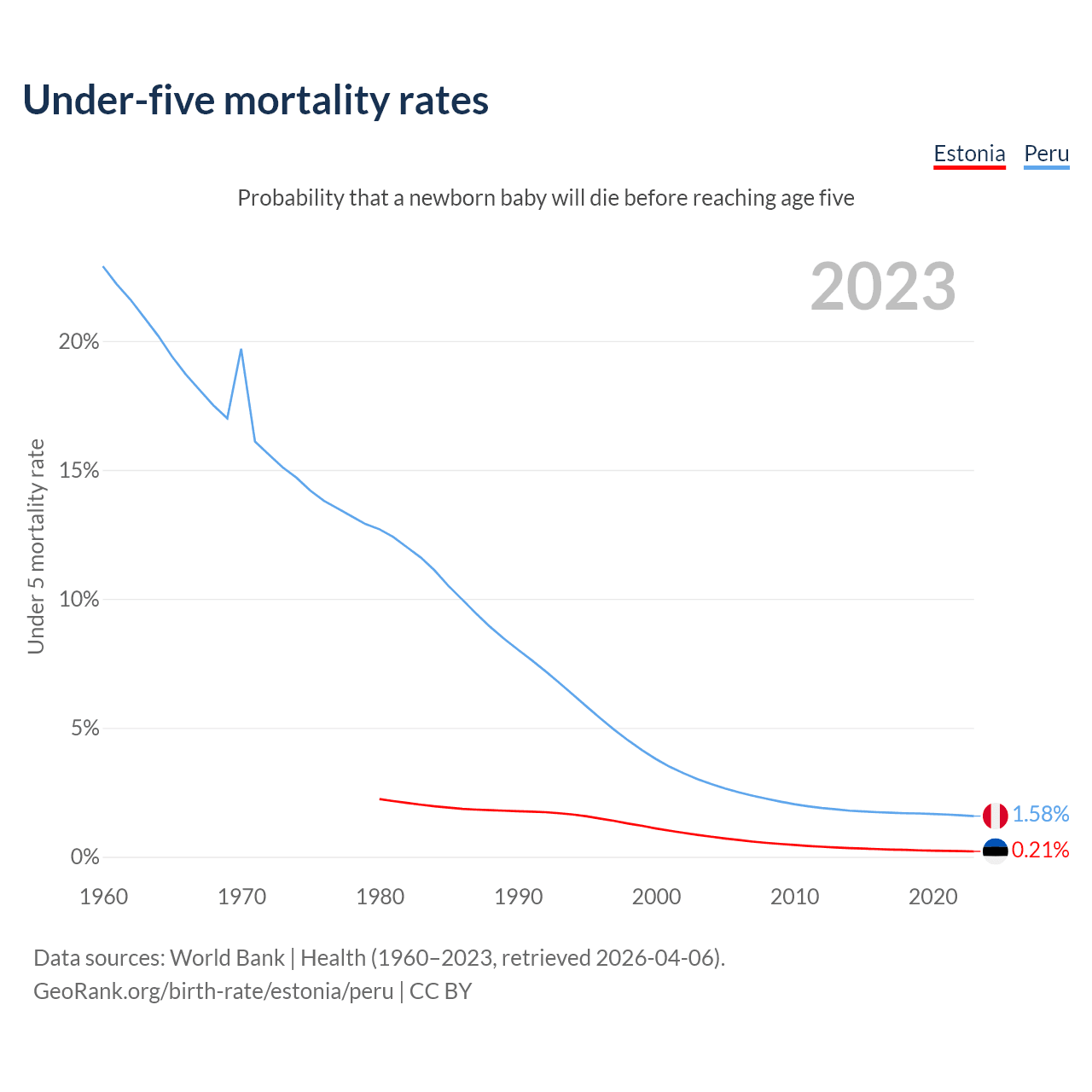 The chance that a newborn baby will die before reaching age five is 0.21% in Estonia and 1.58% in Peru. Above is a chart with historical data on under-five mortality rates.