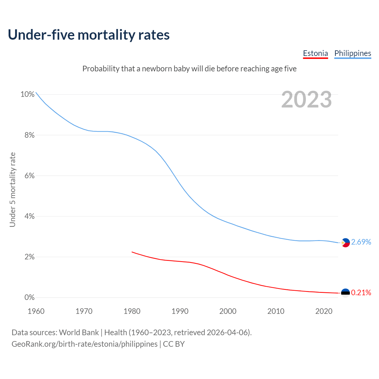 The chance that a newborn baby will die before reaching age five is 0.21% in Estonia and 2.69% in the Philippines. Above is a chart with historical data on under-five mortality rates.