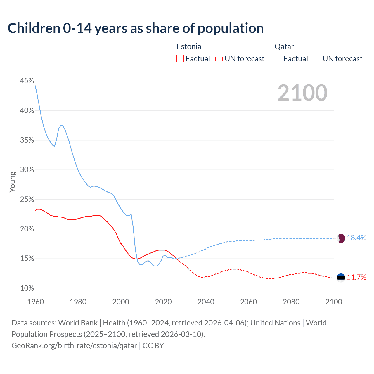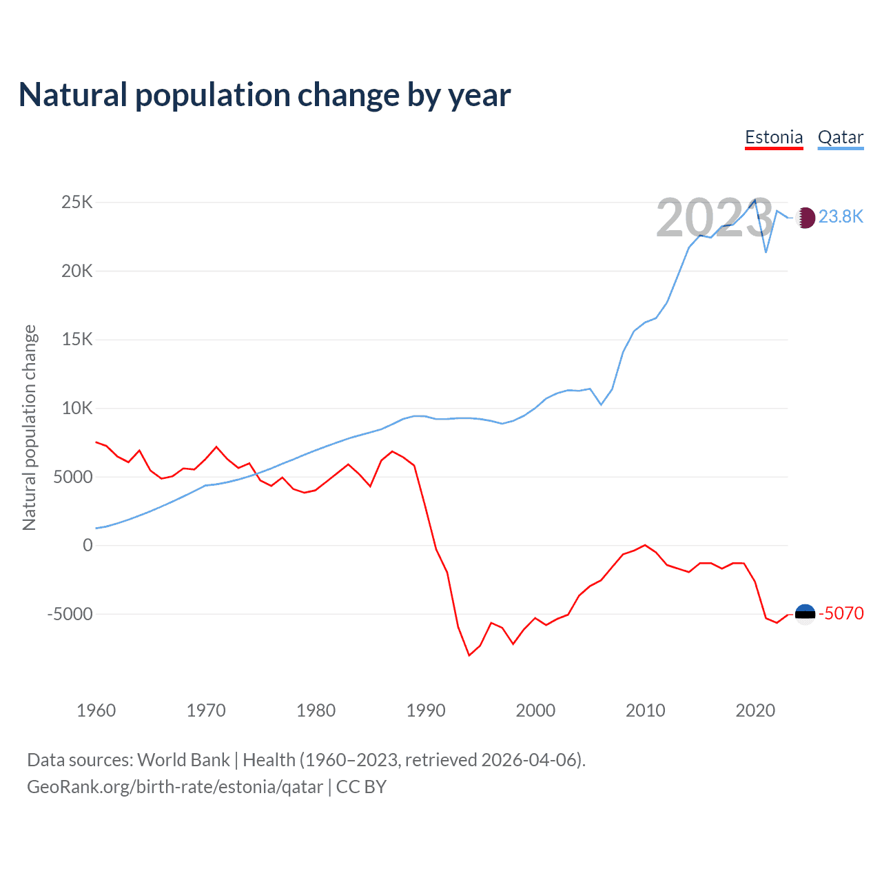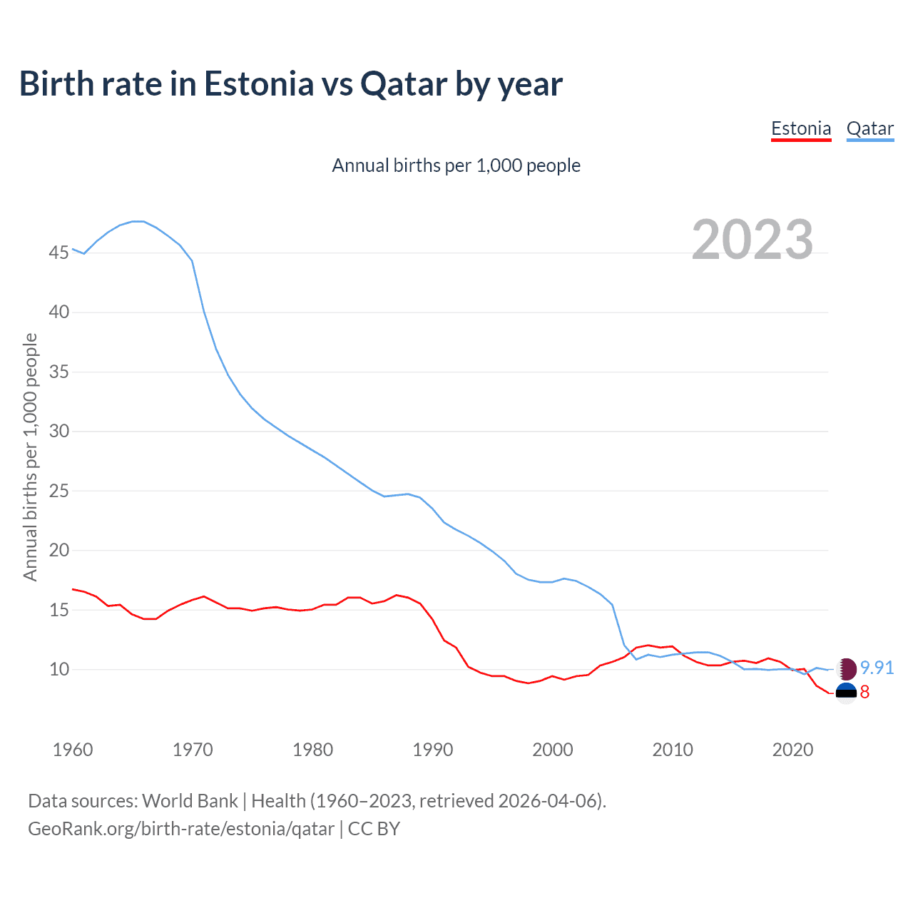 Estonia has an annual birth rate of 8 births per 1,000 people, compared to 9.91 for Qatar. The average number of children a woman is expected to have during her lifetime — the fertility rate, is 1.31 in Estonia and 1.73 in Qatar — 32% difference.