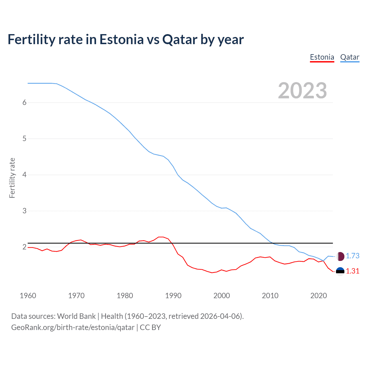 According to the latest available data on birth rates, the fertility rate in Estonia was 1.31 children per woman in 2023, compared to 1.73 in Qatar in 2023. The replacement level is considered to be 2.1 children per woman.
