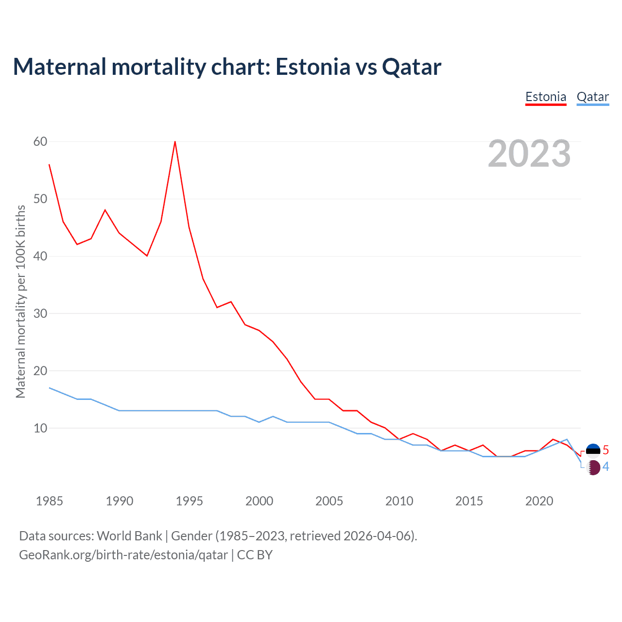 The maternal mortality rate, which is the probability of dying during childbirth or within 42 days of pregnancy termination, is 5 deaths per 100,000 live births in Estonia, compared to 4 deaths in Qatar.
